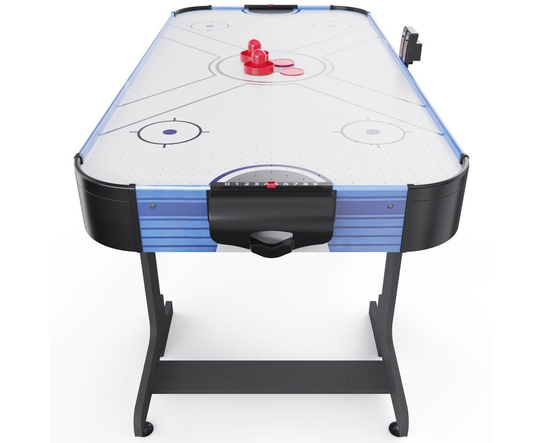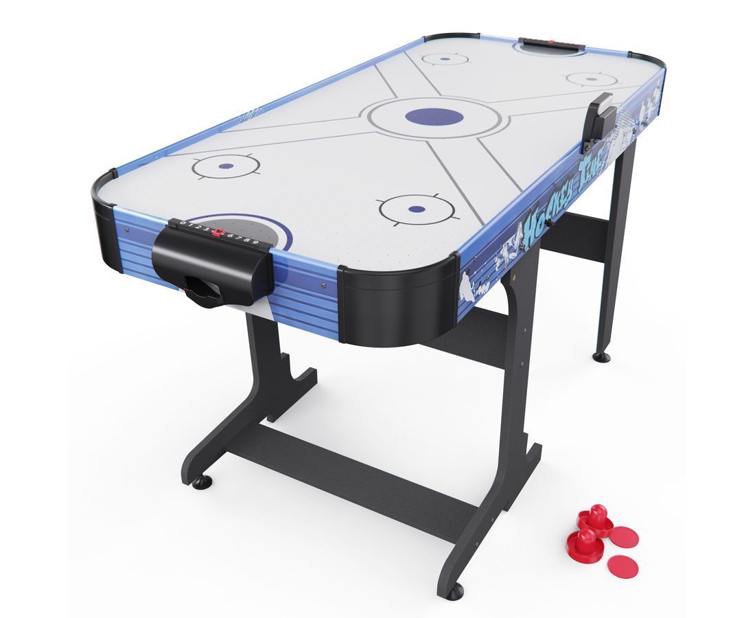 Встроенный вентилятор на 220В создает воздушную подушку, по которой шайба скользит практически без трения — именно так достигается эффект настоящего аэрохоккея. Для удобства игроков стол оснащён электронным и механическим счётчиком очков, что позволяет отслеживать результаты в реальном времени.