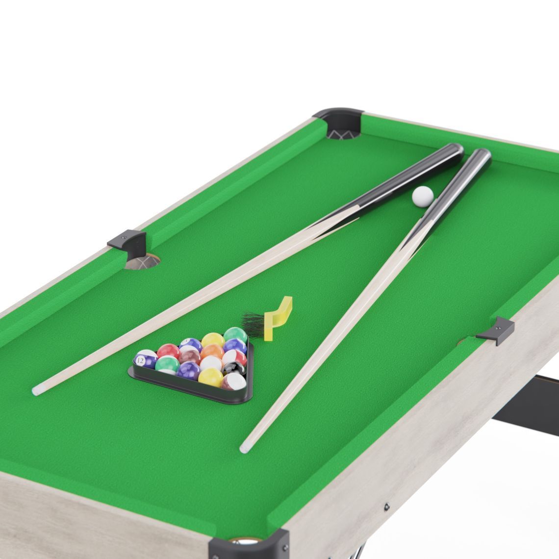 В комплект входят все необходимые аксессуары для игры: шарики, мел, кий, треугольник для выравнивания шаров и щётка для ухода за игровым полем. Длина кия 107 см делает игру удобной для игроков любого роста, а точная регулировка ножек и компенсаторы неровностей пола позволяют выставить стол идеально ровно, обеспечивая стабильность и безопасность во время игры. Высота ножек — 66 см, что создаёт комфортное положение для игры стоя.