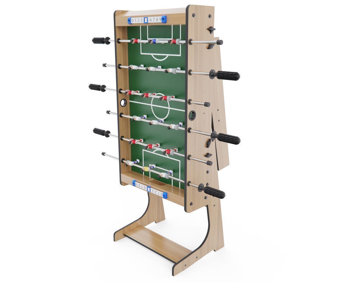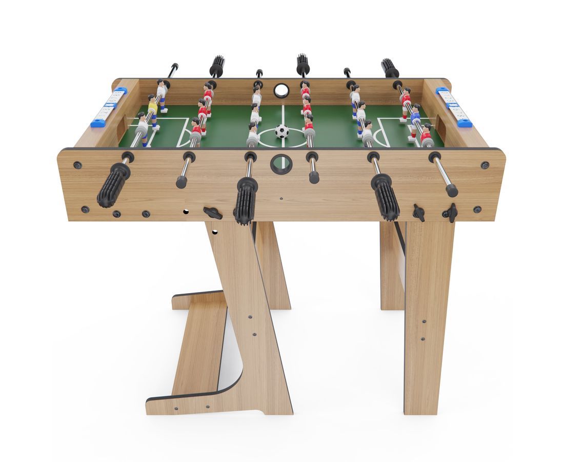 Высота ножек 60,5 см обеспечивает удобное расположение стола в помещении. Складная модель позволяет быстро сложить кикер после игры и убрать его на хранение, что особенно удобно для домашнего формата. В комплект входят 2 футбольных мяча, поэтому можно начинать игру сразу после сборки.