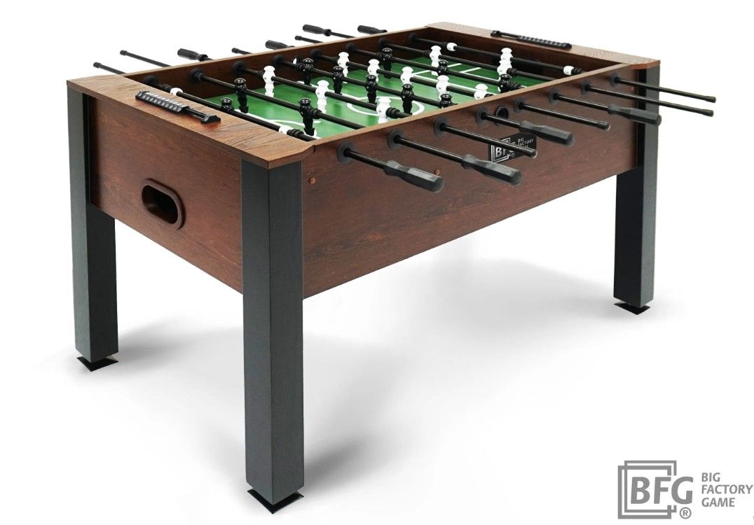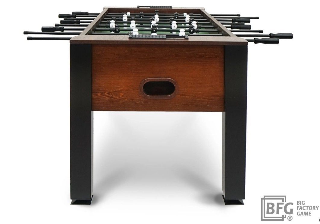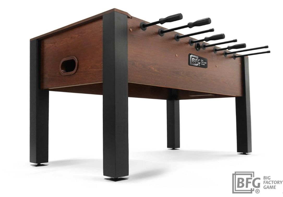 Стол оборудован профессиональными штангами и стилизованными фигурками игроков, выполненными из долговечных и прочных материалов. Ключевым преимуществом модели является материал - стол изготовлен из натурального массива древесины с применением шпона ценных пород.