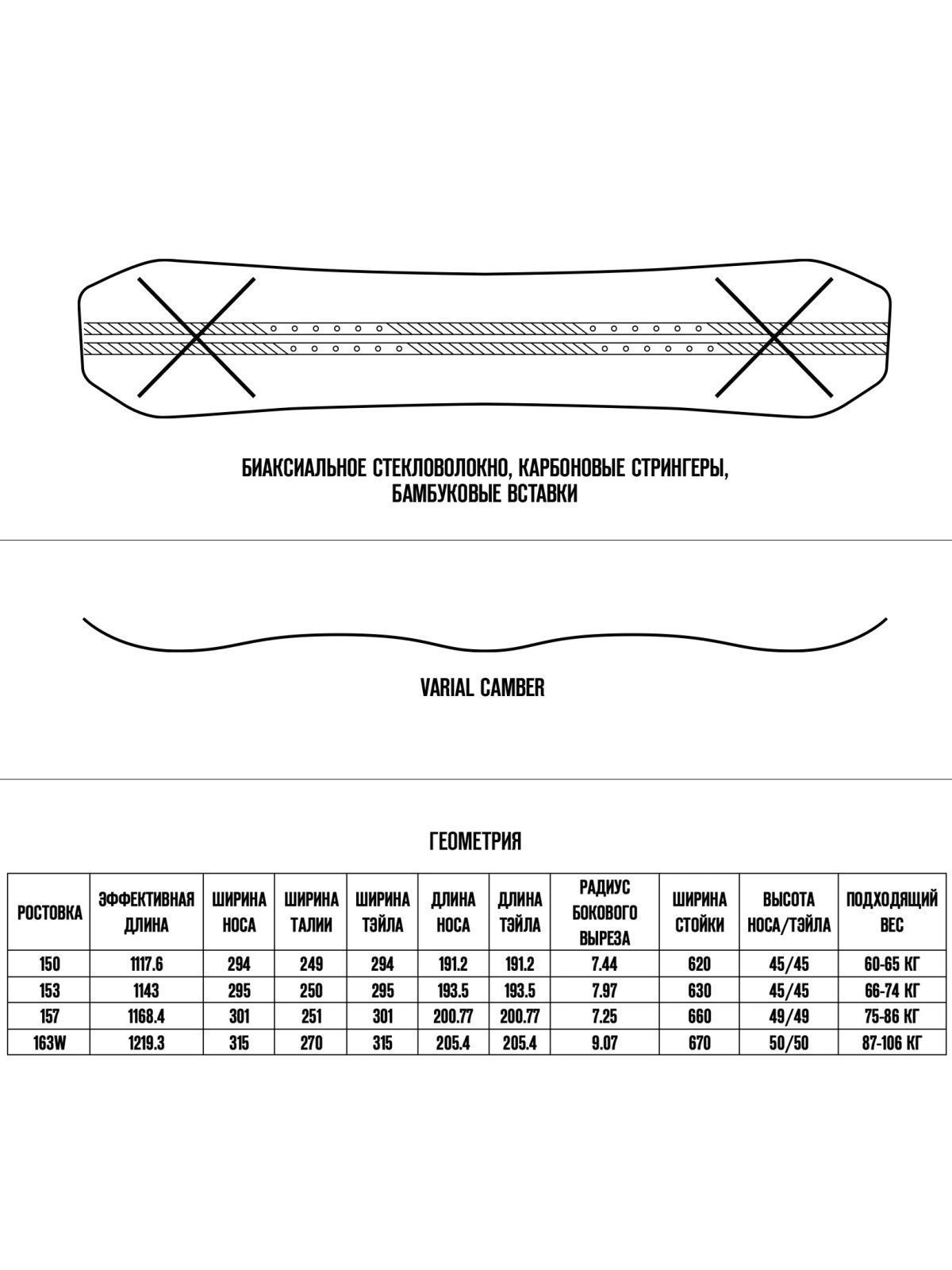 Строгий дизайн и отсылка к HIP-HOP сопровождению бренда. Доска заточена на активное катание, именно поэтому она усилена не только бамбуковыми вставками, но и крестообразно уложенными карбоновыми стрингерами, придающими прочность и силу щелчка. А благодаря универсальному Varial camber, идеально подобранной чуть выше средней жесткости, доска подходит для разнопланового катания. Доска создана для активно прогрессирующих райдеров.