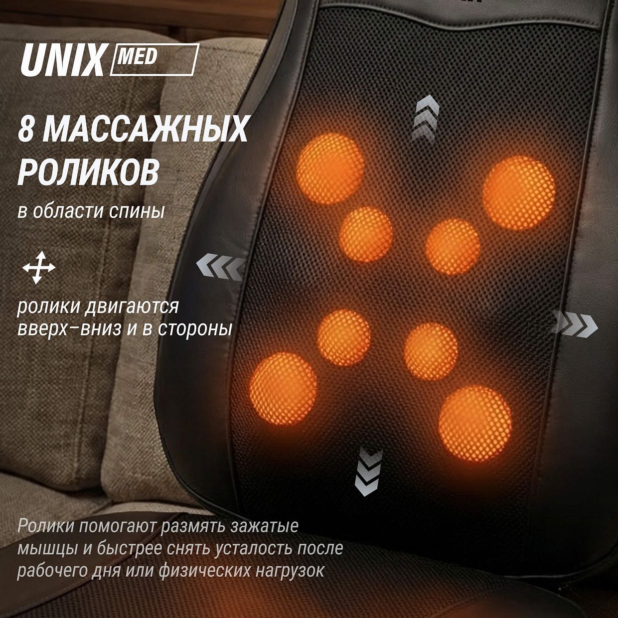 Unix Flex Relax Black оснащена 12-ю встроенными массажными роликами: 4 ролика воздействуют на область шеи, улучшая кровообращение и снимая напряжение, 8 вращающихся роликов разного размера массируют спину и поясницу, глубоко проходя по мышцам и устраняя усталость. Смена направления вращения роликов идеальна для более равномерного массажа. Дополнительные виброподушки мягко стимулируют ягодицы, поддерживая тонус и способствуя общему релаксу организма. Предусмотрено 3 варианта интенсивности: низкая, средняя, высокая.
