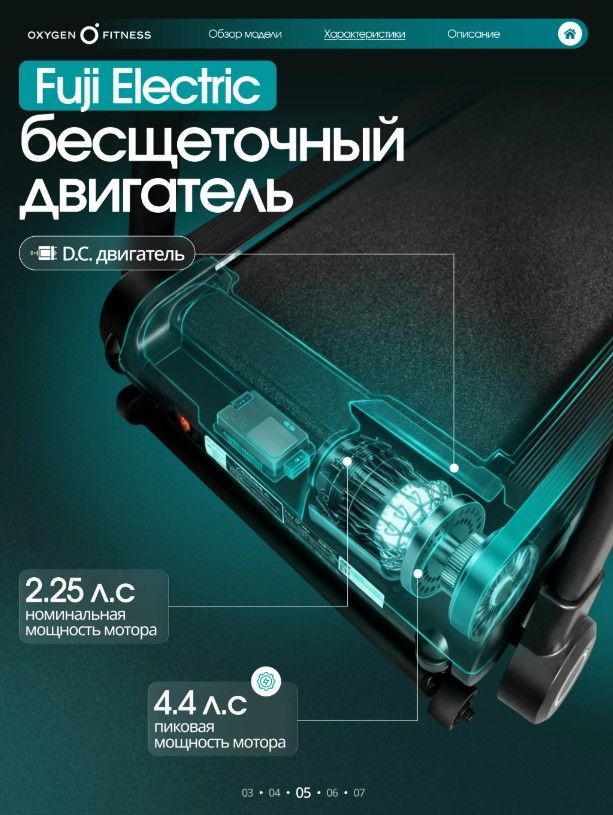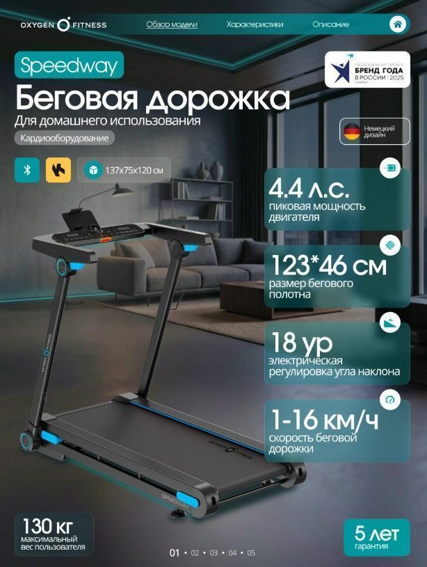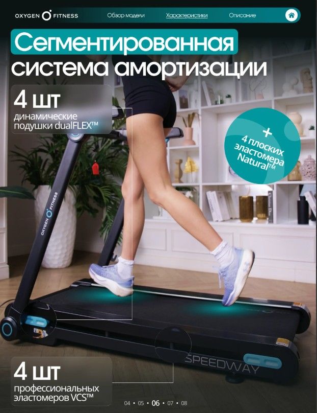 ОписаниеOXYGEN FITNESS SPEEDWAY — функциональная домашняя беговая дорожка с электронным углом наклона, продвинутой амортизацией и интерактивной интеграцией с Kinomap™. Бесщеточный двигатель 2.25 л.с. Fuji Electric (пиковая мощность 4.4 л.с.) обеспечивает стабильную и тихую работу. Скорость от 1 до 16 км/ч подходит для ходьбы, лёгкого и интенсивного бега. Полотно 123 × 46 см и дека 15 мм создают устойчивую и безопасную зону для тренировки. Система амортизации сочетает подушки dualFLEX™, эластомеры Natural™ и VCS™, снижая ударную нагрузку на суставы. 18 уровней наклона позволяют варьировать интенсивность и имитировать подъёмы. Bluetooth и интерактивная интеграция с Kinomap™ автоматически регулируют угол наклона по профилю маршрута. LED-дисплей отображает основные параметры тренировки. 17 программ, сенсорные датчики пульса, управление скоростью и наклоном на поручнях, подставка под планшет, держатель для бутылки. Прочная рама с антикоррозийной обработкой, ударопрочный пластик HIPS. Складная конструкция, транспортировочные ролики. Максимальный вес пользователя — 130 кг. OXYGEN FITNESS SPEEDWAY — технологичное решение для эффективных домашних тренировок с расширенным функционалом и комфортной амортизацией.