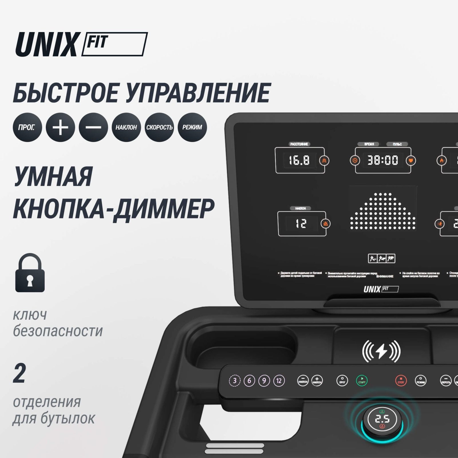 UNIX Fit MX-970 — это инновационная электрическая беговая дорожка премиум-класса с беспроводной зарядкой для дома, созданная специально для тех, кто ценит эффективность тренировок, удобство эксплуатации и современные технологии. Этот тренажёр идеально подойдёт как новичкам, так и опытным спортсменам благодаря своей универсальности и множеству полезных функций.