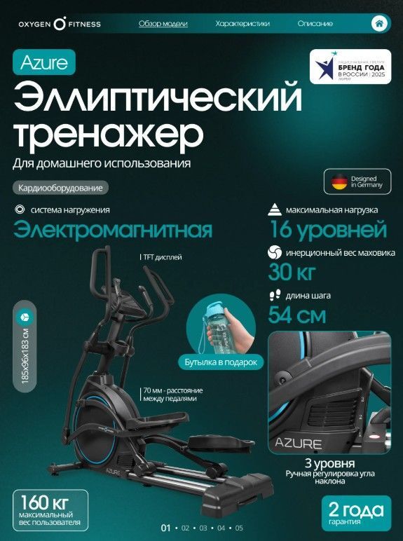 ОписаниеOXYGEN FITNESS AZURE — высокотехнологичный эллиптический тренажёр для домашних тренировок продвинутого уровня. Модель ориентирована на пользователей, которым важна длина шага, точная настройка нагрузки, работа по пульсу и расширенная аналитика тренировки. AZURE сочетает в себе эргономику клубного оборудования и функциональность, адаптированную для комфортного использования дома. Тренажёр построен на высокопрочной раме с антикоррозийной обработкой и двухслойной покраской, что обеспечивает устойчивость и долговечность конструкции. Корпус выполнен из ударопрочного полистирола HIPS, рассчитанного на длительную эксплуатацию. Ключевые особенности движения: • Инерционный вес маховика 30 кг (BioFusion™) при реальном весе 10 кг — ровный, стабильный и тихий ход. • Длина шага 540 мм — максимально естественная траектория, близкая к беговой, подходит пользователям разного роста. • Минимальное расстояние между педалями — 70 мм, что снижает нагрузку на колени и тазобедренные суставы. • Дисковый шатун — повышенная надёжность и точность передачи усилия. • Ручная регулировка угла наклона (3 уровня) позволяет смещать акцент нагрузки и разнообразить тренировочный процесс. Антискользящие педали увеличенного размера обеспечивают уверенную фиксацию стопы даже при интенсивной работе. AZURE использует электромагнитную систему нагружения с 16 уровнями сопротивления, регулируемыми электронно. Это обеспечивает точную и плавную настройку нагрузки под любые цели — от восстановительных тренировок до интенсивной кардиоработы. Тренажёр оснащён современной TFT-консолью с расширенным набором показателей: • время, скорость, дистанция, • калории, пульс, уровень нагрузки, • программа, Ватты, количество шагов, • общая дистанция. Программный пакет включает 21 режим тренировки: • быстрый старт и ручной режим, • 12 предустановленных программ, • 4 пульсозависимые программы, • 1 программа целевого пульса, • режим работы по Ваттам. Для контроля пульса предусмотрены сенсорные датчики на поручнях. Рукоятки двухпозиционные, с нескользящим покрытием. Дополнительные возможности: • Bluetooth-колонка для воспроизведения аудио, • подключение к интернету, • функция проекции экрана, • подставка под планшет или смартфон, • интерфейс на английском языке. OXYGEN FITNESS AZURE — эллиптический тренажёр для тех, кто хочет получить максимум от домашних кардиотренировок: продвинутую биомеханику, интеллектуальные программы и уровень комфорта, сравнимый с профессиональным фитнес-клубом.