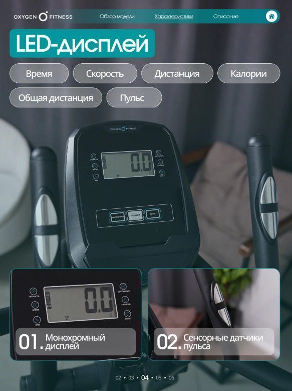 ОписаниеOXYGEN FITNESS GALENA FLD — компактный и функциональный эллиптический тренажёр для домашних тренировок, ориентированный на регулярные кардиозанятия с акцентом на комфорт, плавность хода и экономию пространства. Передний привод, складная конструкция и автономная работа делают модель удобным решением для квартиры, позволяя поддерживать физическую форму без сложной установки и подключения к электросети. Тренажёр построен на прочной конструкции с использованием ударопрочного полистирола HIPS, устойчивого к износу и механическим нагрузкам. Передний привод и инерционный вес маховика 24 кг (BioFusion™) при реальном весе 6 кг обеспечивают плавное и равномерное движение без рывков. Длина шага 460 мм подходит для большинства пользователей и создаёт комфортную амплитуду движения при ходьбе и умеренно интенсивных тренировках. Расстояние между педалями 80 мм способствует устойчивому положению ног, а трёхкомпонентный шатун повышает надёжность педального узла и срок службы тренажёра. Двухпозиционные нескользящие рукоятки с сенсорными датчиками пульса позволяют задействовать мышцы верхней части тела и контролировать частоту сердечных сокращений во время занятий. OXYGEN FITNESS GALENA FLD использует магнитную систему нагружения с 10 уровнями сопротивления, регулируемыми вручную. Такой тип нагрузки работает тихо, не требует обслуживания и идеально подходит для домашних условий. Тренажёр не нуждается в подключении к электросети, что упрощает его размещение в любом помещении. Консоль оснащена монохромным LED-дисплеем и отображает основные параметры тренировки: • время, • скорость, • дистанцию, • калории, • пульс, • общую дистанцию. Доступные режимы работы — быстрый старт и ручной режим. Интерфейс поддерживает русский и английский языки. Одно из ключевых преимуществ модели — складная конструкция, позволяющая существенно сократить занимаемое пространство после тренировки. В сложенном виде тренажёр сохраняет компактные габариты и удобен для хранения. Для повседневного комфорта предусмотрены: • транспортировочные ролики, • компенсаторы неровностей пола, • подставка под планшет или смартфон, • держатель для бутылки. OXYGEN FITNESS GALENA FLD — практичный эллиптический тренажёр для дома, сочетающий плавность хода, надёжную конструкцию и удобство хранения, идеально подходящий для регулярных кардиотренировок в ограниченном пространстве.