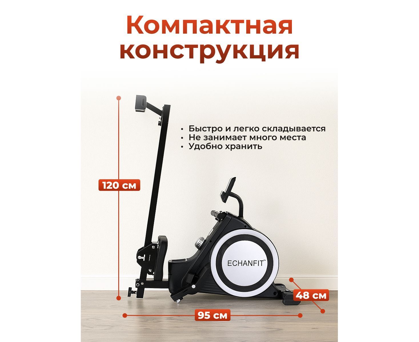 Тренажёр складной, что позволяет компактно хранить его в сложенном виде, экономя пространство в квартире или доме. Компактные габариты в сложенном состоянии делают его удобным для хранения даже в небольших помещениях.