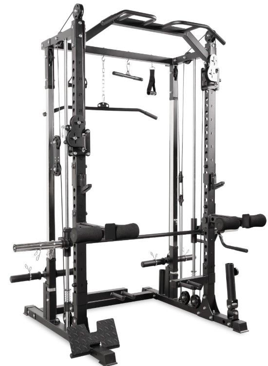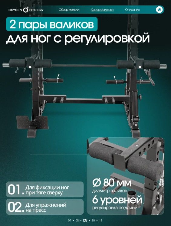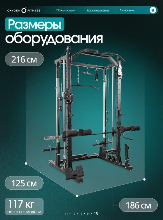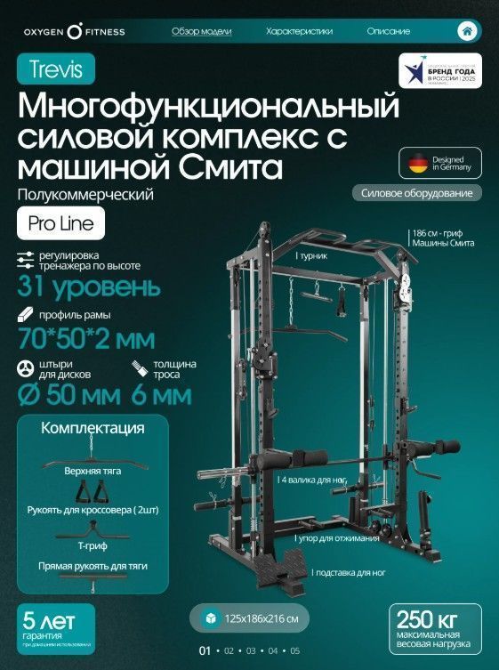 ОписаниеOXYGEN FITNESS TREVIS - это универсальный силовой комплекс с полноценной машиной Смита, созданный для эффективных домашних тренировок с функционалом профессионального уровня. Конструкция работает со свободными весами и обеспечивает безопасное выполнение десятков упражнений: от жима и приседаний до тяг, кроссоверных движений и тренировок корпуса. Максимальная нагрузка — 250 кг, что делает комплекс подходящим как для продвинутых спортсменов, так и для тех, кто строит свою силовую базу дома. Основу комплекса составляет усиленная рама прямоугольного профиля 70×50 мм с толщиной металла 2 мм, обеспечивающая жёсткость, устойчивость и плавный ход всех узлов. Габариты: 125 × 186 × 216 см. Вес нетто - 117 кг. Комплекс оснащён: • надёжным грифом машины Смита диаметром 50 мм, • ограничителем движения грифа, • 31 уровнем регулировки по высоте, позволяющими точно подстроить рабочую зону, • накопителями под диски Ø50 мм, • стаканом для хранения грифа, • 4 парами пружинных замков. В конструкции предусмотрены различные точки опоры: подставка для ног для горизонтальной тяги, упор для отжиманий, а также регулируемые валики для ног Ø80 мм (6 уровней настройки). Комплекс обеспечивает возможность выполнения тренировки всего тела благодаря широкому набору аксессуаров и функциональных зон: • рукоятки для верхней тяги, • две рукоятки кроссовера, • прямая рукоятка для тяг, • Т-гриф для станово-тяговых движений. Пользователь может выполнять: • приседания и жимы в машине Смита, • вертикальную и горизонтальную тягу, • упражнения на руки и плечи через кроссовер, • становую тягу, тягу Т-грифа, • отжимания, работу на мышцы спины, груди, рук и ног. Максимальный вес пользователя — 250 кг.