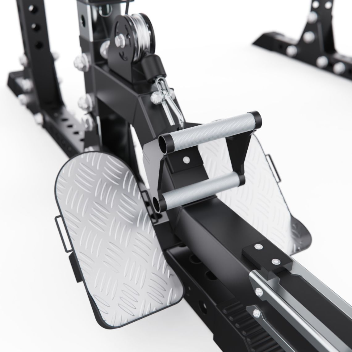 Для комфортных и безопасных занятий тренажер оборудован мягкими валиками, снижающими нагрузку на ноги и суставы, рифлеными педалями для устойчивого упора, а также удобными сиденьями, обеспечивающими комфорт как при стандартных упражнениях, так и при выполнении гребных движений.