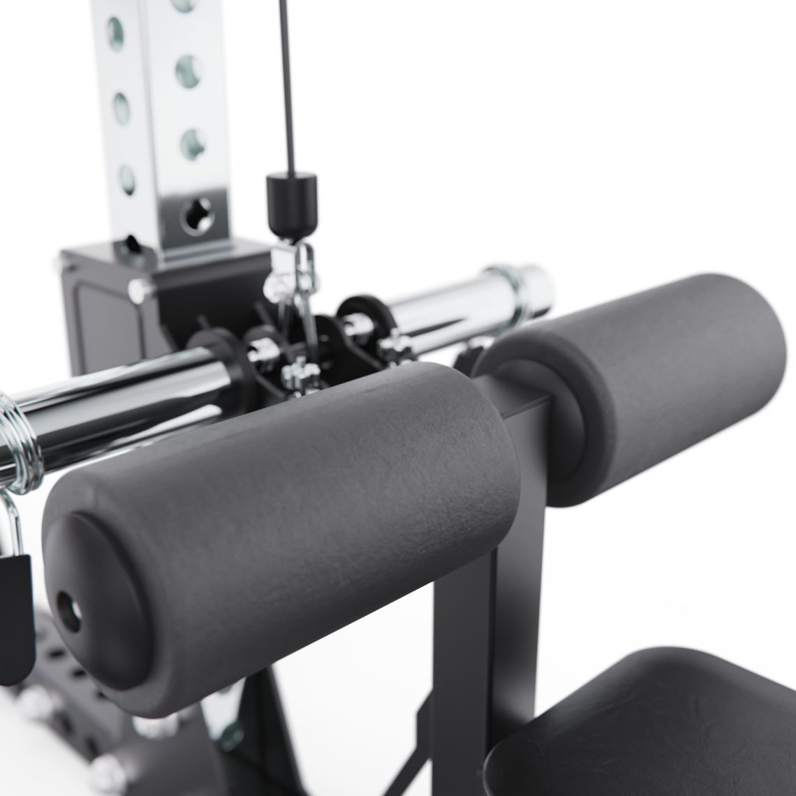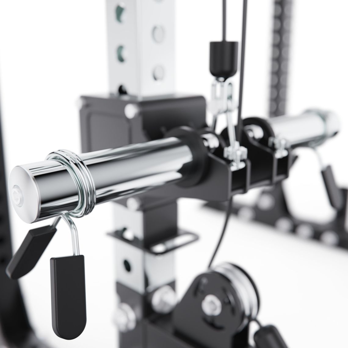 Верхняя тяга оснащена W-образной рукоятью, а многопозиционный турник позволяет выполнять различные варианты подтягиваний и упражнений на верх тела, делая тренировки более разнообразными.
