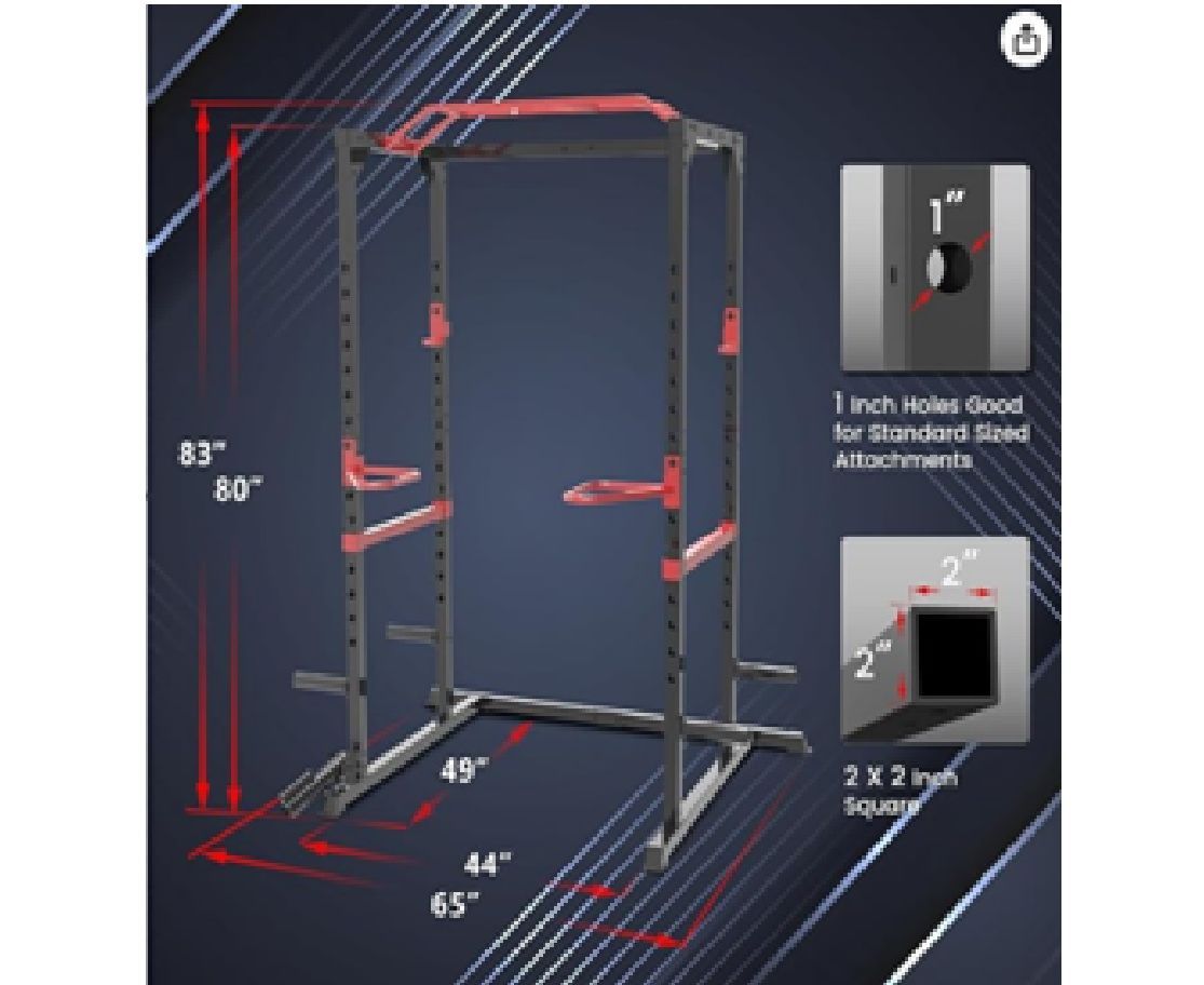 Рама выполнена из прочного стального профиля 50 х 50 х 1,5 мм, что обеспечивает надёжность и устойчивость конструкции. Посадочный диаметр — 50 мм, а количество посадочных мест — 4, что позволяет комфортно размещать и хранить диски + пружинные зажимы в комплекте. Максимальная нагрузка на держатель штанги и страховочную трубу составляет 100 кг, а на грузовую трубу — 50 кг, позволяя постепенно увеличивать рабочие веса.