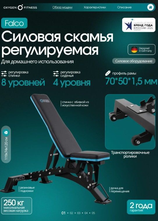 ОписаниеСиловая скамья OXYGEN FITNESS FALCO создана для надежной и интенсивной тренировки дома. Прочная рама с прямоугольным профилем 70×50 мм и толщиной 1,5 мм обеспечивает высокую устойчивость и сохраняет жесткость конструкции при любой нагрузке. Эргономичные подушки заполнены PU-поролоном и обтянуты долговечной искусственной кожей, устойчивой к износу и удобной в уходе. Скамья поддерживает широкий спектр упражнений благодаря продуманной кинематике регулировок: • 8 уровней наклона спинки — от отрицательного до вертикального; • 4 уровня положения сиденья, позволяющие точно настроить посадку под конкретное упражнение; • Размеры подушек: спинка 80×29×5.5 см, сиденье 31×28×5.5 см — оптимальный баланс жёсткости и комфорта. Дополнительный плюс — транспортировочные ролики, которые облегчают перемещение скамьи по тренировочному пространству. В рабочем состоянии модель имеет параметры: 119×74×120 см (Д×Ш×В). Скамья рассчитана на серьёзные нагрузки: • Максимальная нагрузка: 250 кг • Максимальный вес пользователя: 200 кг При этом сама конструкция весит всего 22 кг.