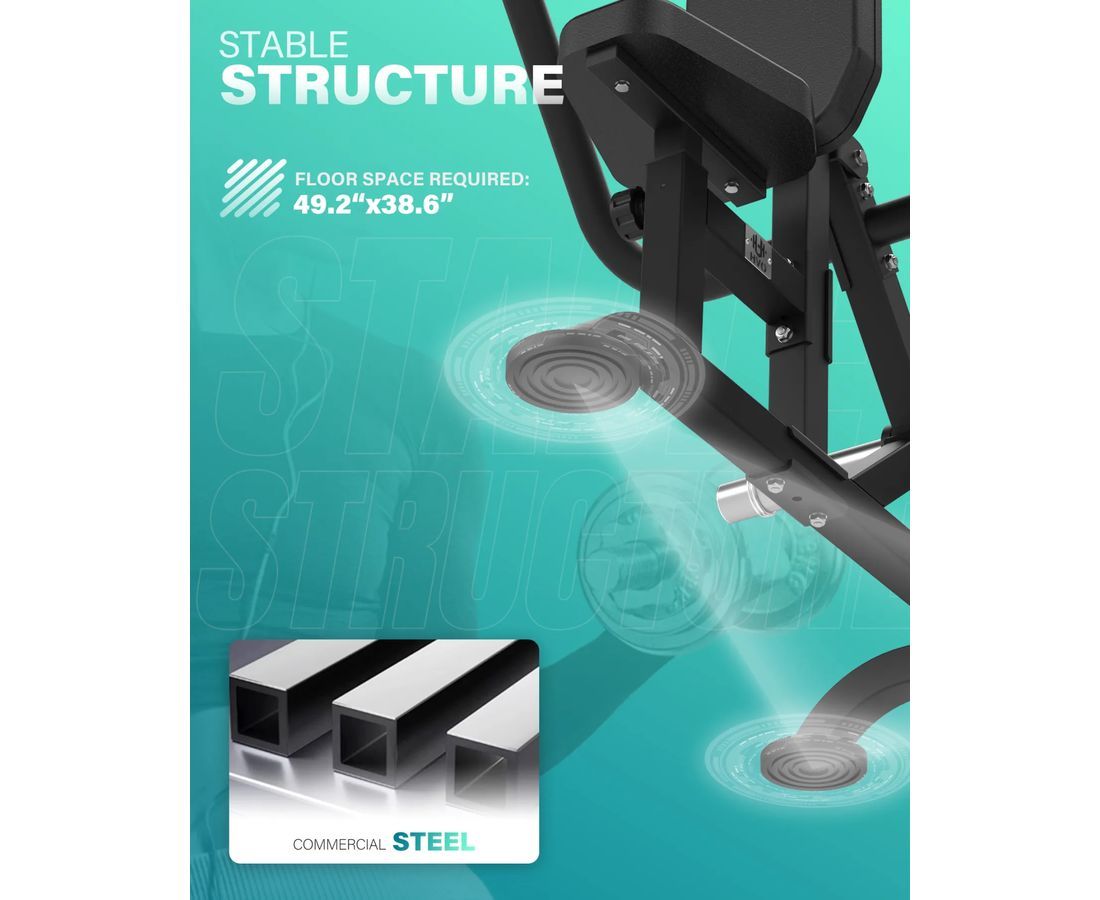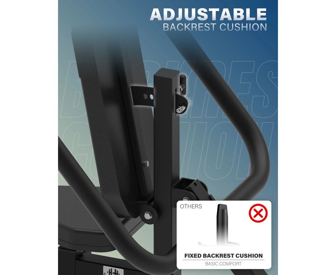 Устройство имеет 4 уровня регулировки сиденья и 5 уровней регулировки спинки, что позволяет точно подстроить тренажёр под рост и анатомические особенности пользователя. Такая гибкость регулировки обеспечивает правильное положение тела, максимально эффективную проработку мышц и снижает нагрузку на суставы.
