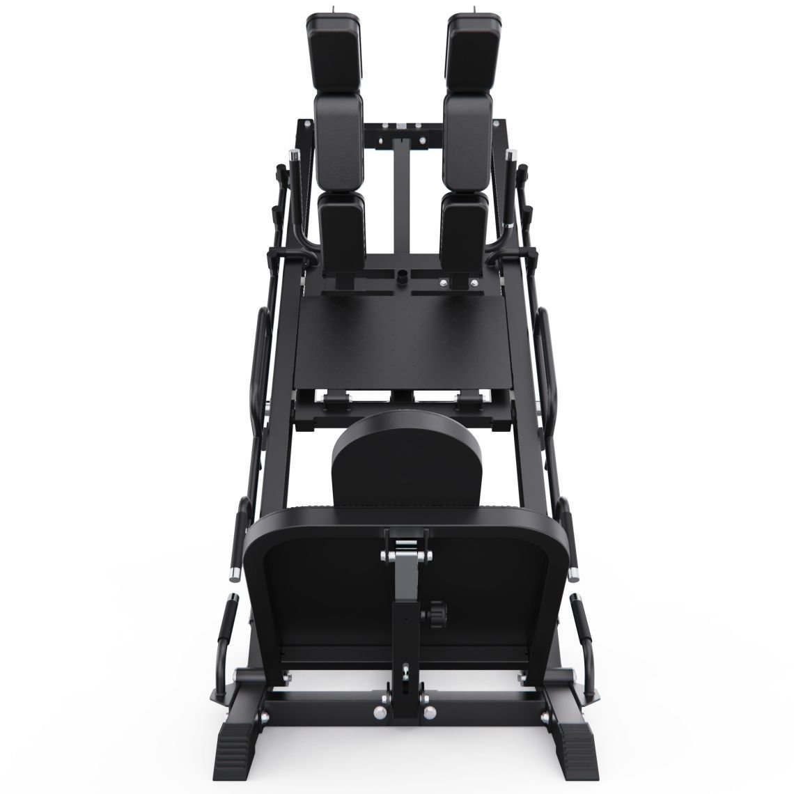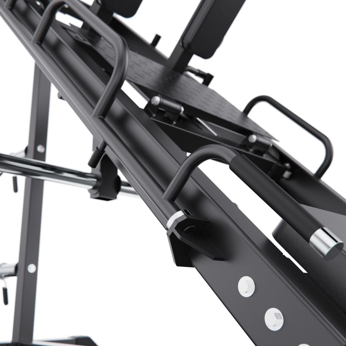 Конструкция позволяет регулировать положение под рост пользователя, а также переставлять спинку, что даёт возможность выполнять различные упражнения в режимах жима ногами и гакк-приседаний. Тренажер имеет прочную раму с профилем 75 х 75 х 3 мм, что гарантирует надежность и долговечность конструкции.