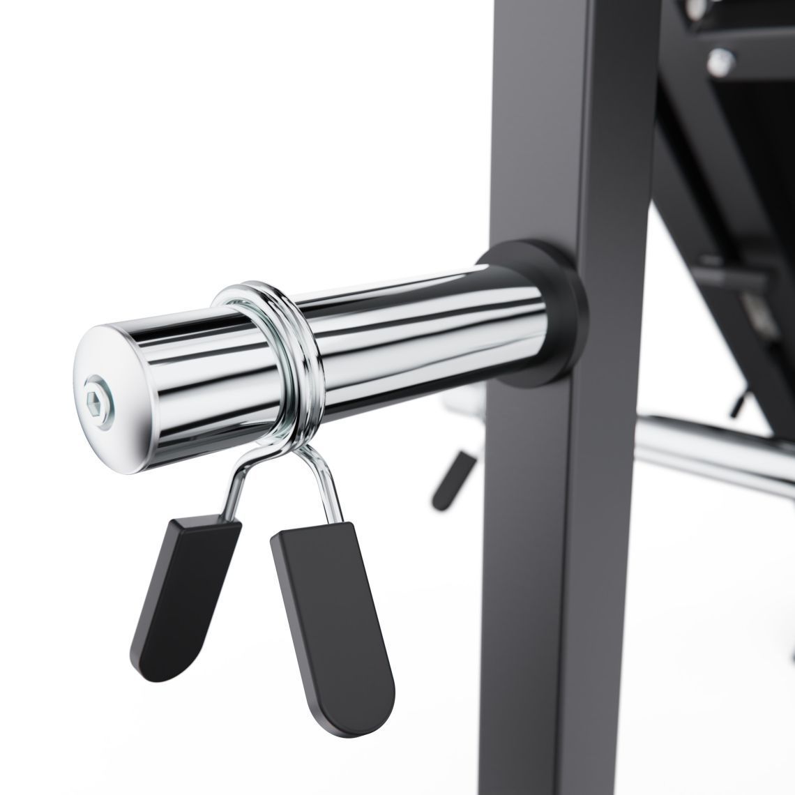 Максимальная нагрузка на узел подвешивания весовых дисков составляет 150 кг, а для хранения дисков — 75 кг. Для удобства и безопасности во время занятий установлен пружинный зажим, который надежно фиксирует диски на грифе, предотвращая их смещение. Такая конструкция обеспечивает стабильность и безопасность при тренировках с большими весами.