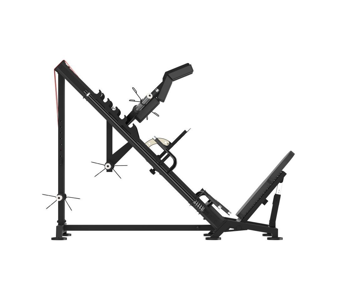 Максимальная допустимая нагрузка составляет до 360 кг. Угол наклона платформы регулируется в пределах 130–150°, а спинка на 4 уровня. Платформа для ног выполнена из рифлёного материала толщиной 3,2 мм, что предотвращает скольжение и обеспечивает безопасность при выполнении упражнений. Конструкция также предусматривает возможность отталкиваться ногами снизу вверх, расширяя вариативность тренировок.