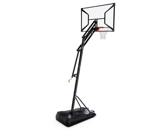 Портативная конструкция с транспортировочными роликами позволяет создать собственную баскетбольную площадку так, как надо именно вам. Основание стойки имеет увеличенный объем. В основание стойки необходимо залить воду (ёмкость бака 128 л.) или засыпать песок (182 кг) в качестве утяжелителя.