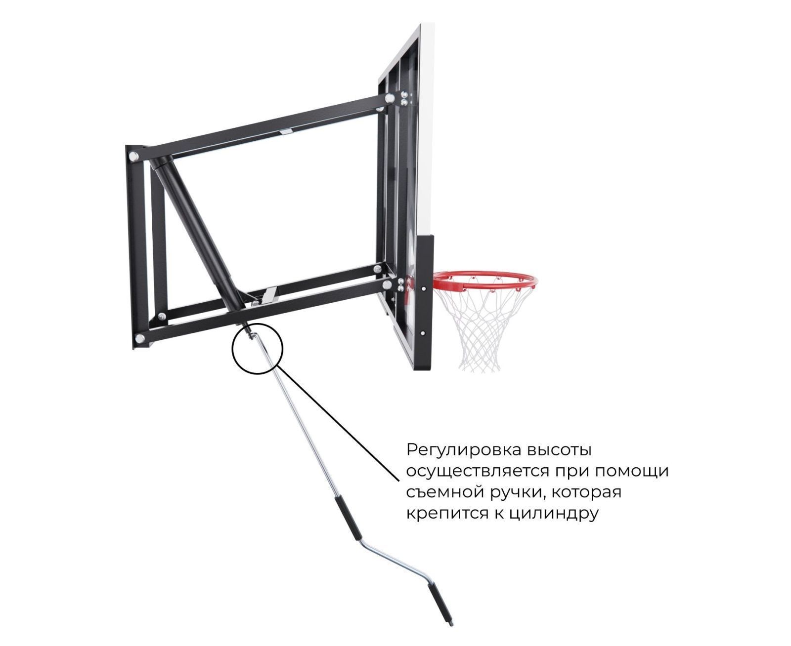 Кольцо стандартного диаметра 45 см устойчиво к интенсивной нагрузке. Благодаря регулируемой высоте кольца от 230 до 305 см, можно адаптировать баскетбольный щит под любой уровень подготовки и возраст игроков. Это особенно удобно при тренировках с детьми или в семейных играх. В целях безопасности запрещается висеть на кольце и других элементах баскетбольного щита.