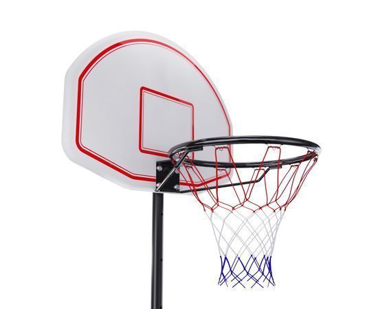 Стойка белого цвета, имеет чёрную рамку корзины диаметром 16 ммх1,0 мм, размер которой составляет 70 x 45 см. Размер кольца составляет 43 см.