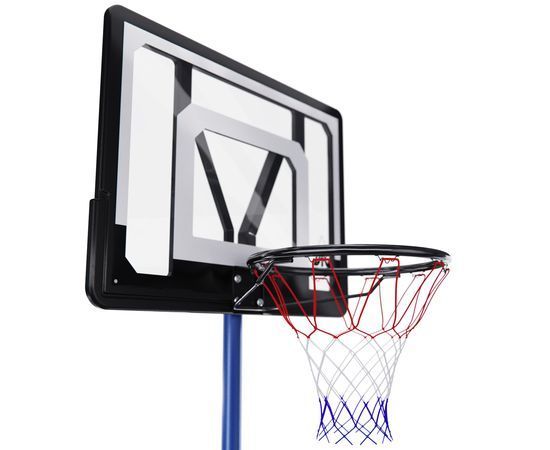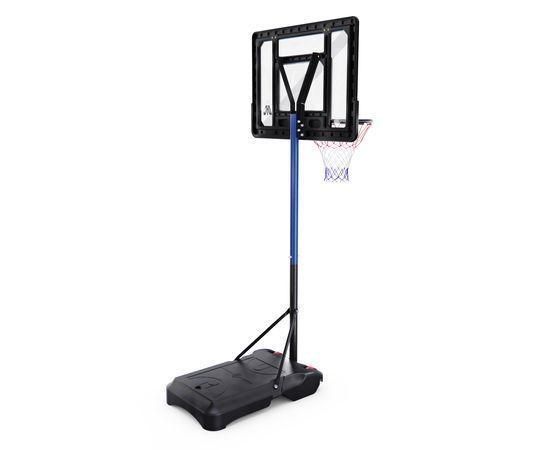 Размер щита составляет 110 x 72 см, а размер кольца — 45 см. Основание размером 90 x 60 x 15 см имеет объём 50 литров, что даёт возможность заполнить его водой или песком для устойчивости.