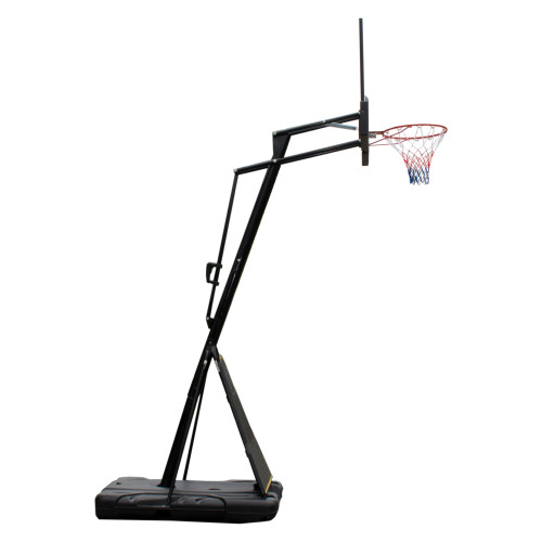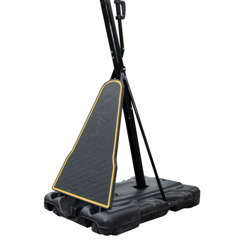 Имеет усиленную, устойчивую конструкцию и усиленное металлическое кольцо с амортизаторами для активной игры. Емкость основания заполняется 150 кг воды или песка. Встроенные в основание транспортировочные колеса облегчают транспортировку. Защитная панель основания предохраняет играющих от получения травм.
