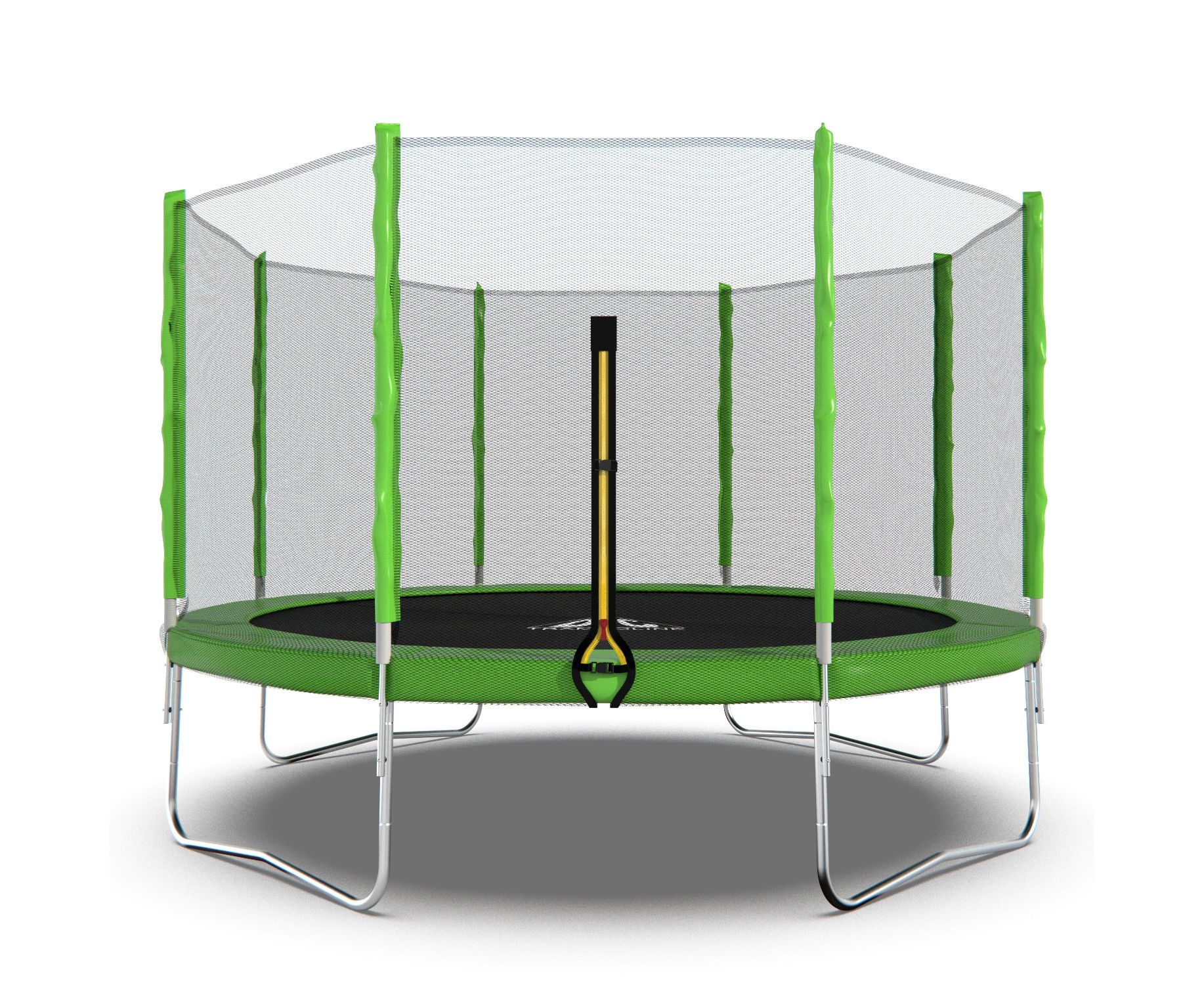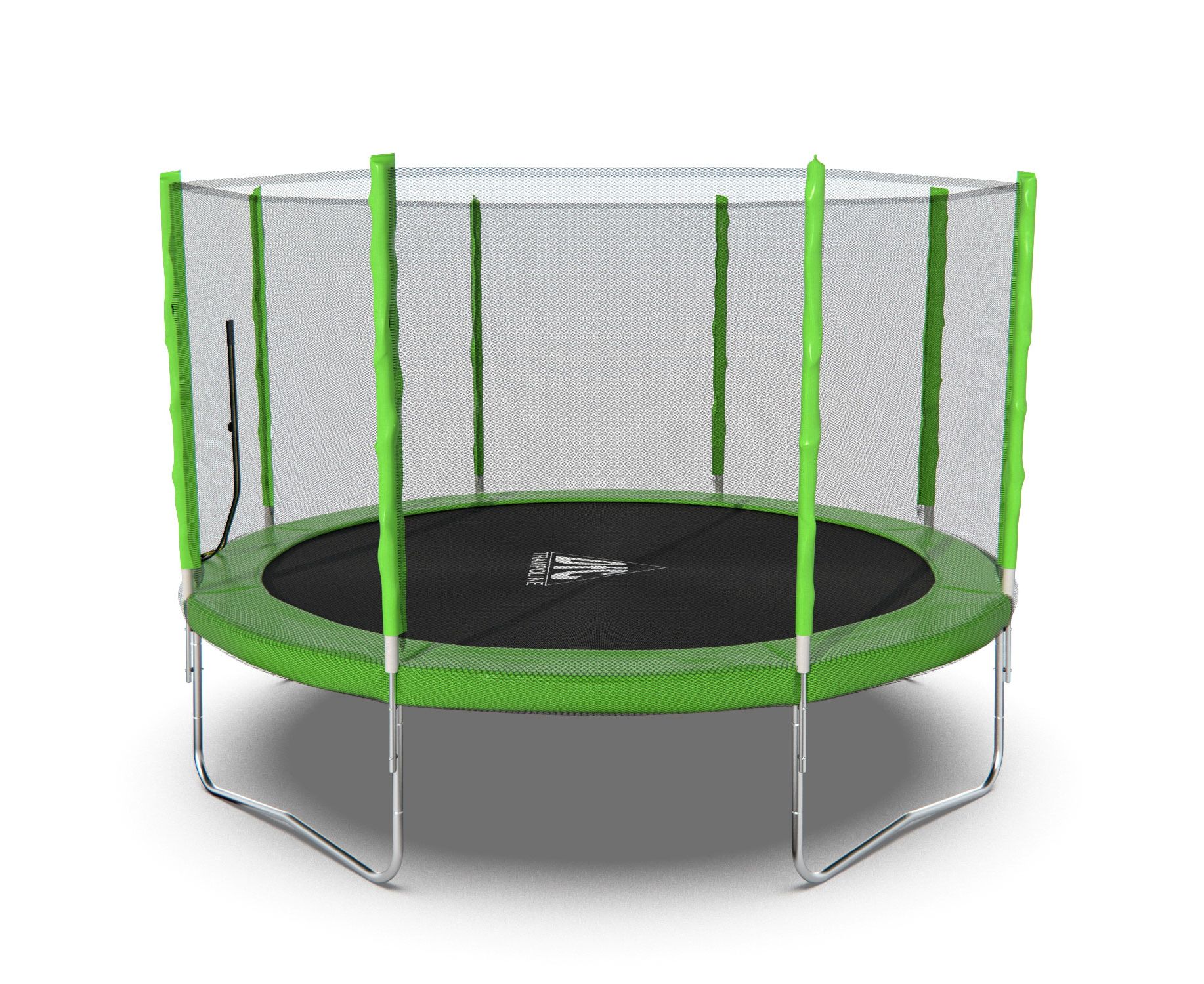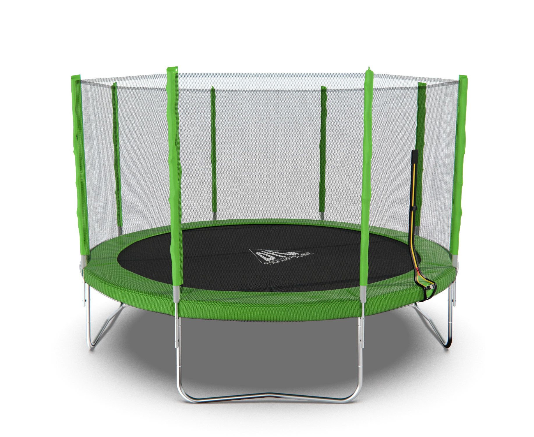 Модель с внешней защитной сеткой и яркой зеленой расцветкой. Высота батутов этой серии от 46 до 85 см.