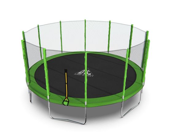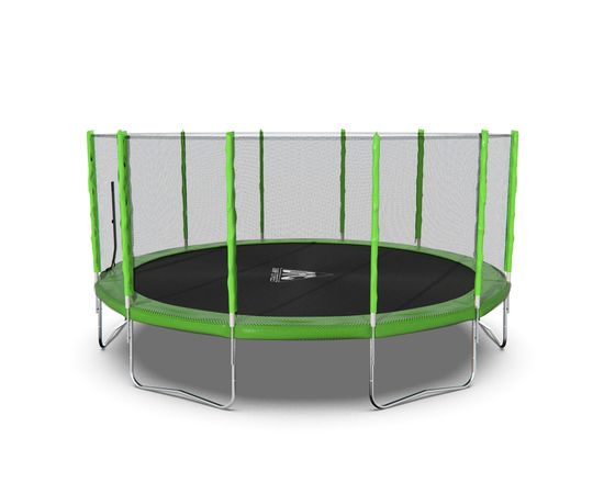 Модель с внешней защитной сеткой и яркой зеленой расцветкой. Высота батутов этой серии от 46 до 85 см.