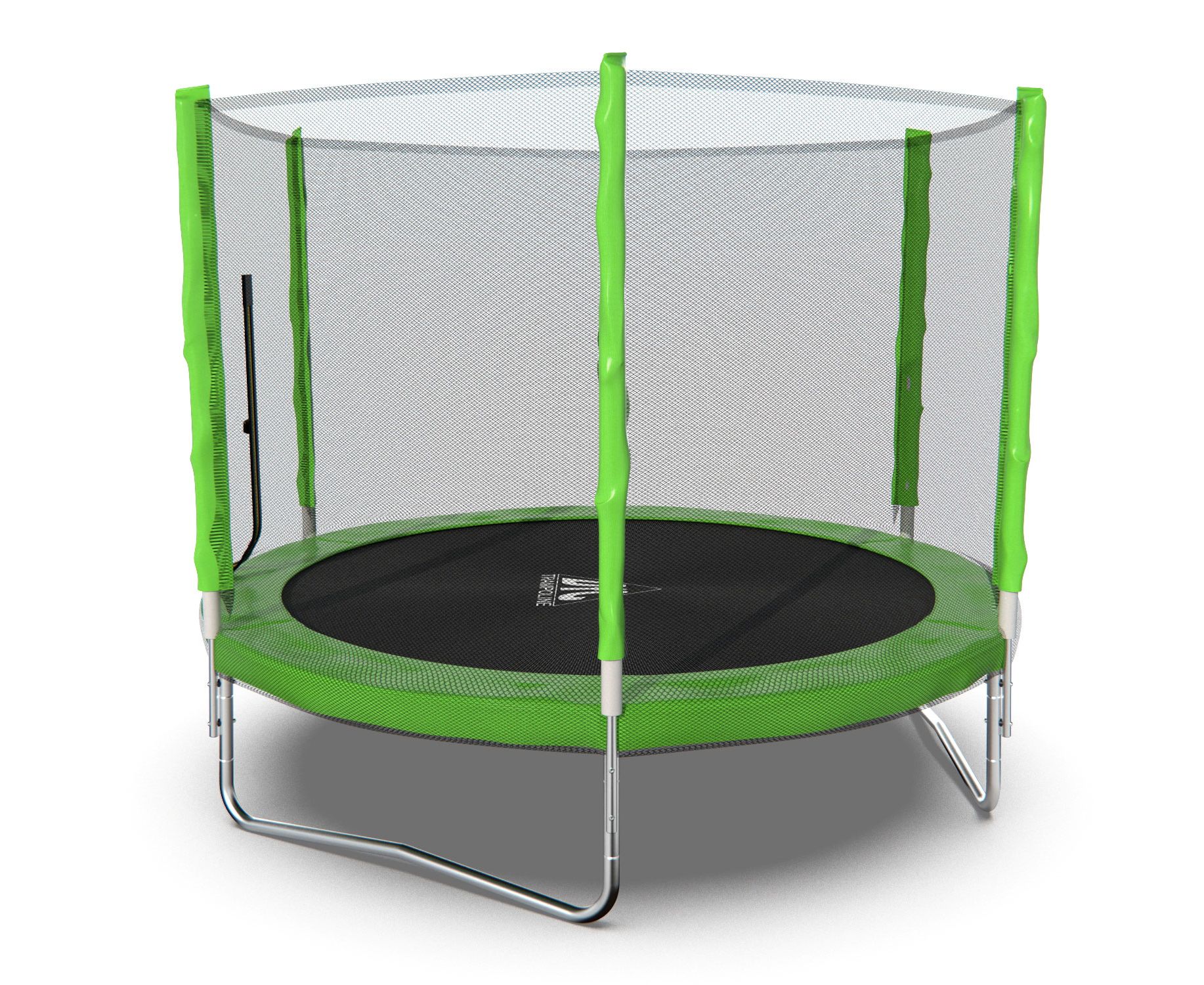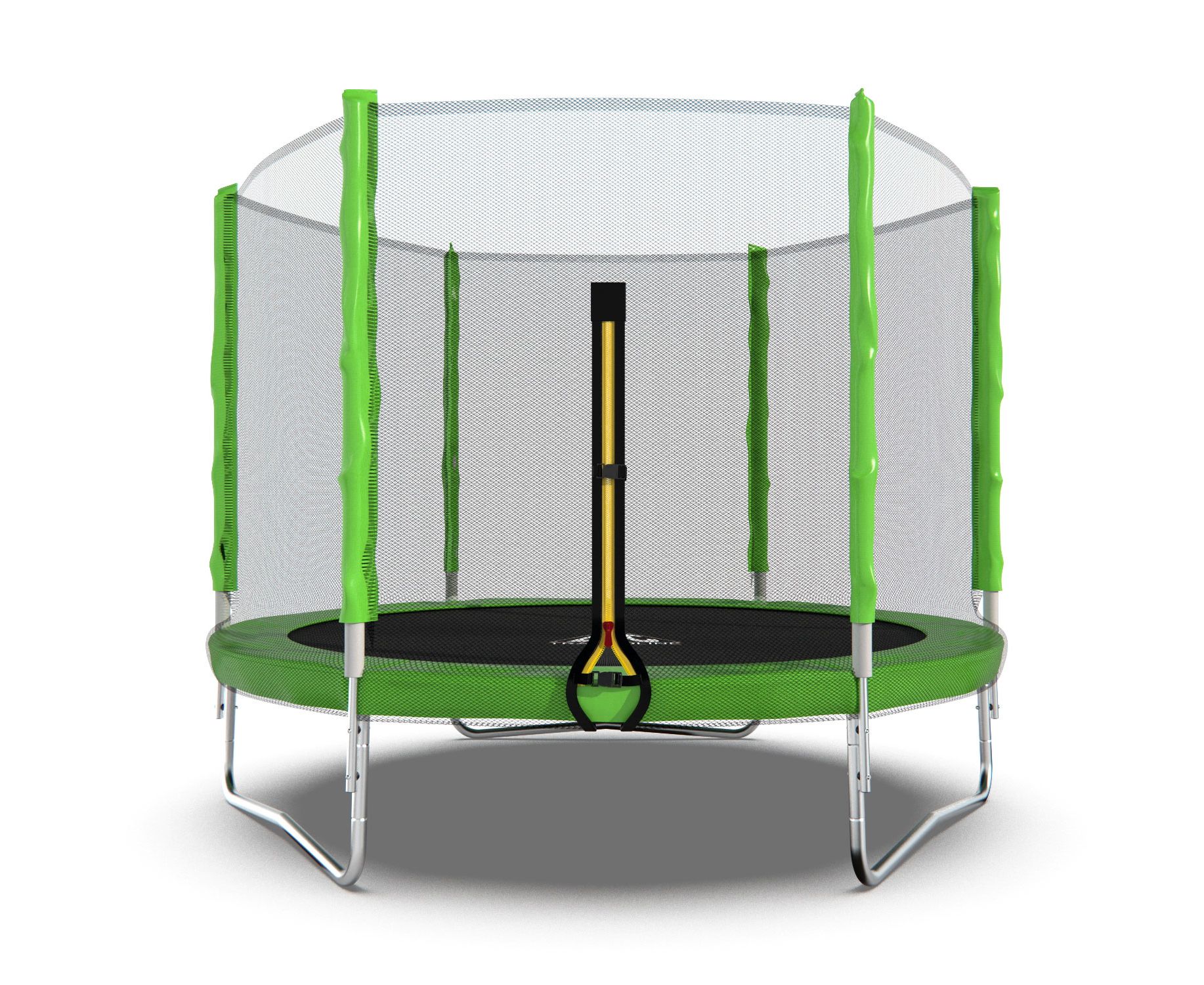 Модель с внешней защитной сеткой и яркой зеленой расцветкой. Высота батутов этой серии от 46 до 85 см.
