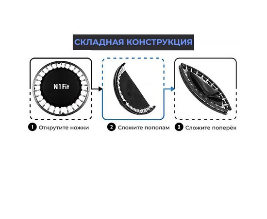 Складной батут DFC N1Fit без сетки разработан с учётом безопасности и комфорта пользователей. Максимальный вес, который он может выдержать, составляет 100 кг, а диаметр этой модели — 40 дюймов (102 см).