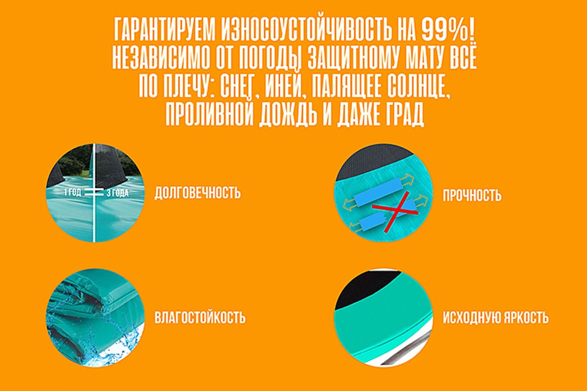Характеристики для батута Наименование Батут Classic Green (3,05 м) Торговая марка HASTTINGS ® Сборка КНР Комплектация батут, защитный мат, защитная сеть, нижняя защитная сеть, лестница Вход на батут самозакрывающийся клапан Диаметр (см) 305 Покрытие рамы двойная оцинковка Каркас батута высокопрочная стальная труба с полимерным покрытием Пружины 54 Основание батута 3 W-ноги Соединительное крепление рамы T-Master Lock Высота рамы (см) 68 Высота защитной сетки (см) 170 Прыжковое полотно перматрон (permatron) Материал сетки терилен (terylene) Защитный мат зеленый полиэстер (polyester) матовый с износоустойчивой подкладкой Максимальный вес пользователя (кг) 150