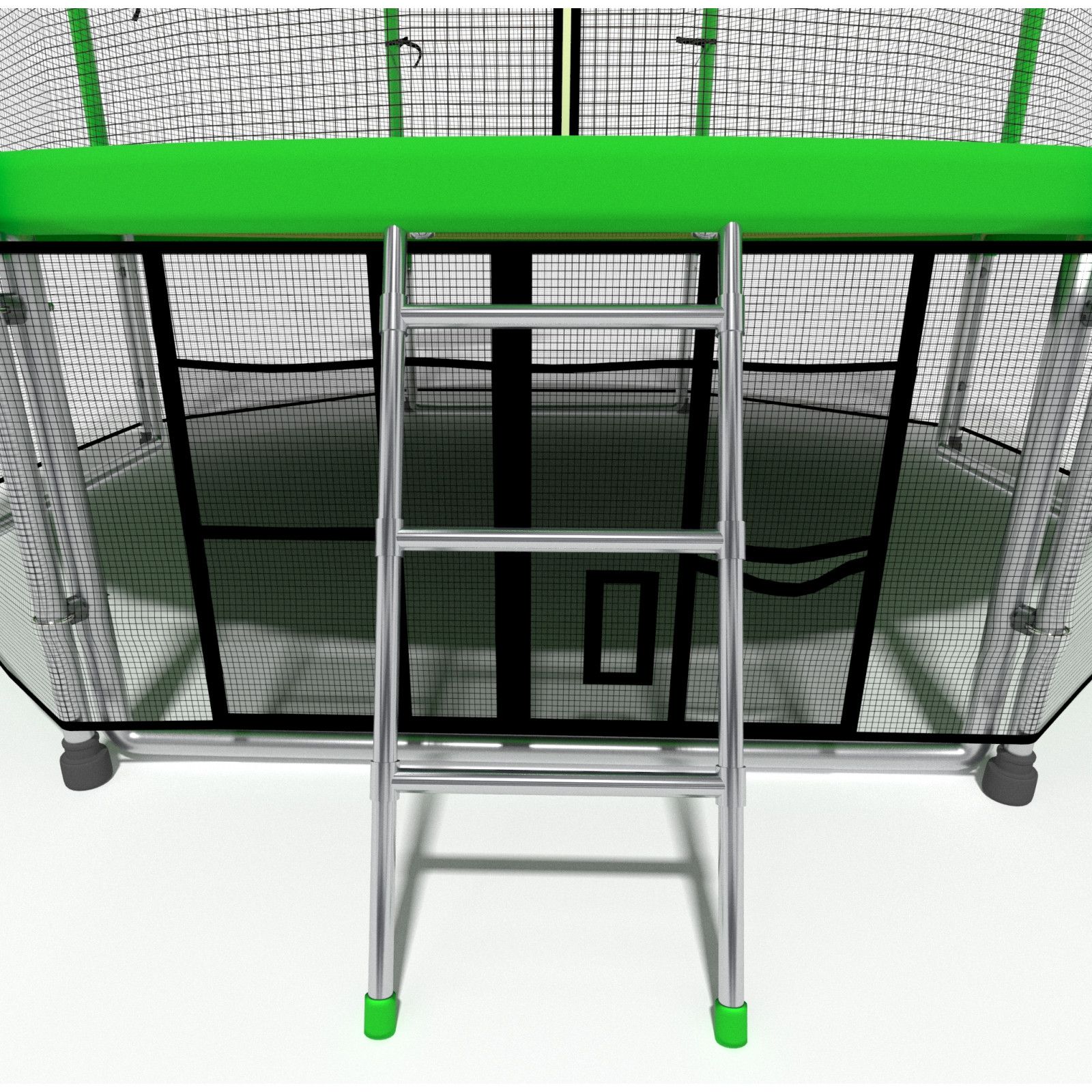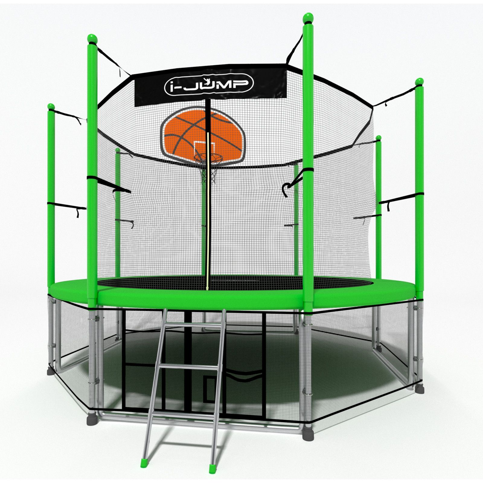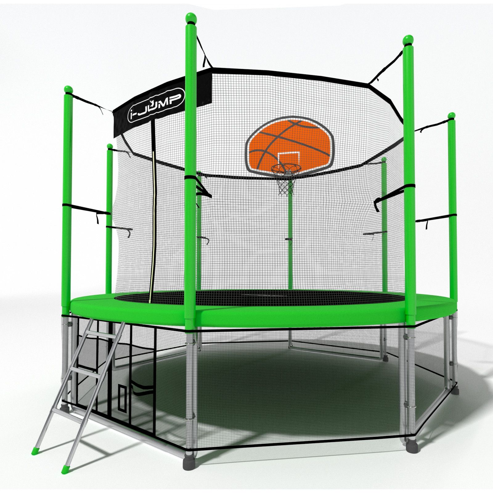 Батуты i-JUMP разработаны в соответствии с последними тенденциями в области безопасности и изготовлены из высококачественных материалов. Данный батут имеет сдвоенные опоры основания, обеспечивающие хорошую устойчивость. Прыжковое полотно сделано в США из полипропиленового мата Permatron с защитой от УФ излучения. Пружины имеют бочкообразную форму для правильного распределения сопротивления металла при растяжении. Все металлические части (опоры, пружины и прочее) изготовлены из оцинкованной стали для предотвращения коррозии. В комплекте есть баскетбольный щит.