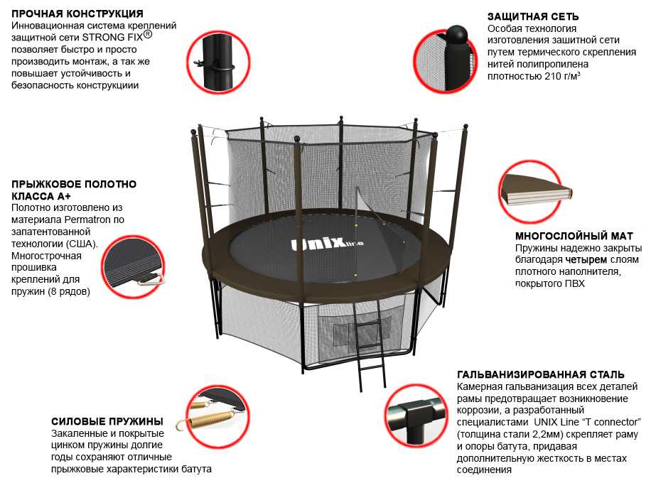Металлический каркас батутов UNIX line™ выполнен из особо прочной гальванизированной стали с использованием новейшей системы креплений деталей рамы батута «T-Conneсtor» (толщина стали 2.2 мм), что обеспечивает высокую надежность рамы и уровень безопасности пользователя, максимально допустимый вес которого, в зависимости от модели (размера), может достигать 160 кг.