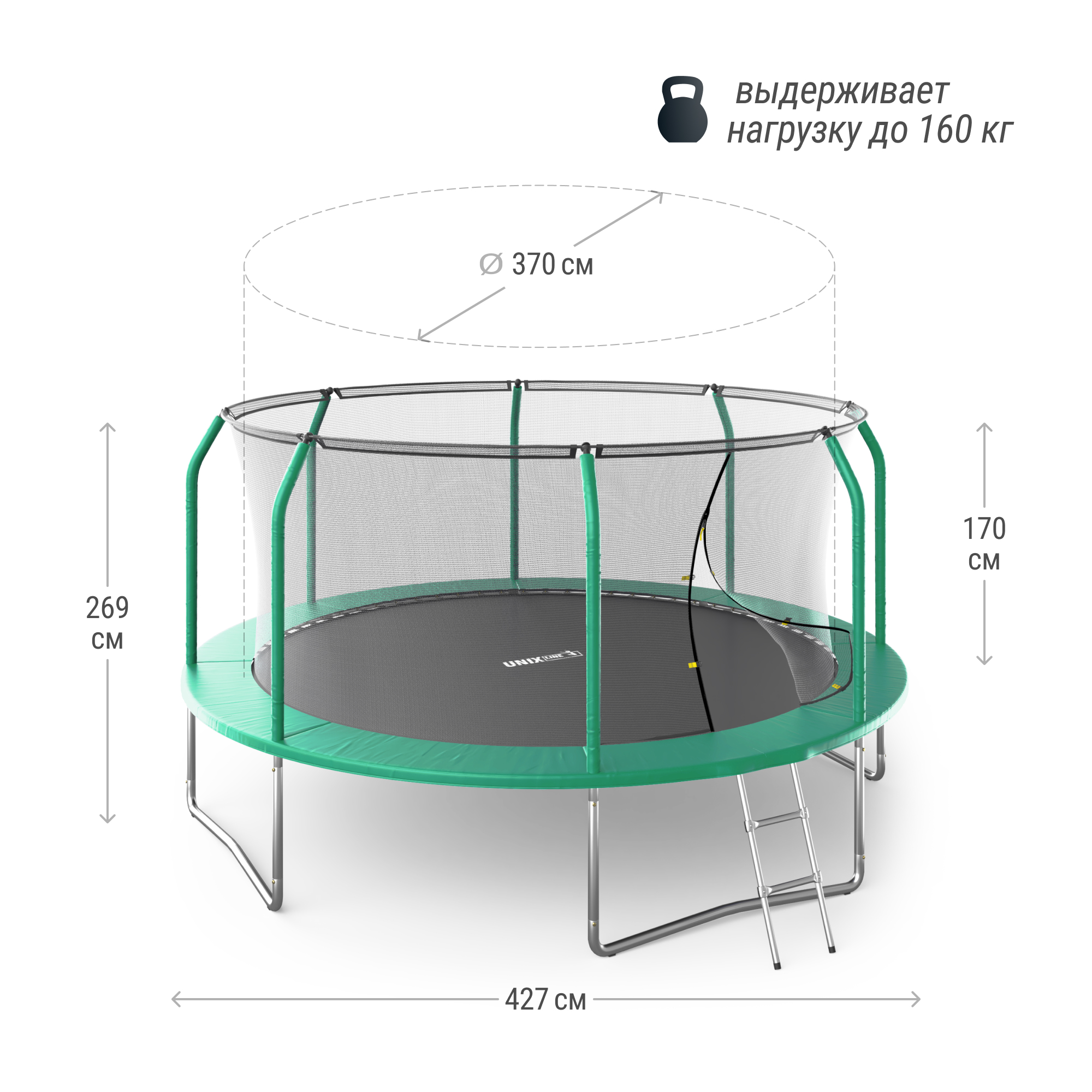 Цвет Зеленый Максимальный вес пользователя (кг) 160 Диаметр батута 4.27 м ( 14 ft ) Лестница в комплекте да Пружины 88 шт Длина пружины 178 мм Основание батута (опоры) 4 W-ноги Толщина стали каркаса 1.60 мм Система крепления рамы и опор X-connector (2.4 мм) Материал прыжкового полотна Перматрон (Permatron) США (cо специальной пропиткой) Дополнительные фиксаторы, (колья) защита от ветра опция (приобретаются отдельно) Высота защитной сети 170 Рама Высокопрочная сталь, противоокислительное покрытие, грунтовая окраска Батут есть Защитный мат есть Защитная сеть есть Лестница есть Гарантия на раму 2 года Фирменная гарантия 1 год В рабочем состоянии, диаметр х высота 427x269 см В упаковке, длина х ширина х высота 174x57x22.5 см; 94x35x21 см Вес комплекта 64 кг Вес комплекта в упаковке 69,8 кг Материал сетки 100% polyethylene(PE) Материал защитного мата PVC Premium material Сертификаты CE, RoHS Производитель UNIX Line Страна изготовления КНР Объем упаковки (м³) 0.292 Характеристики