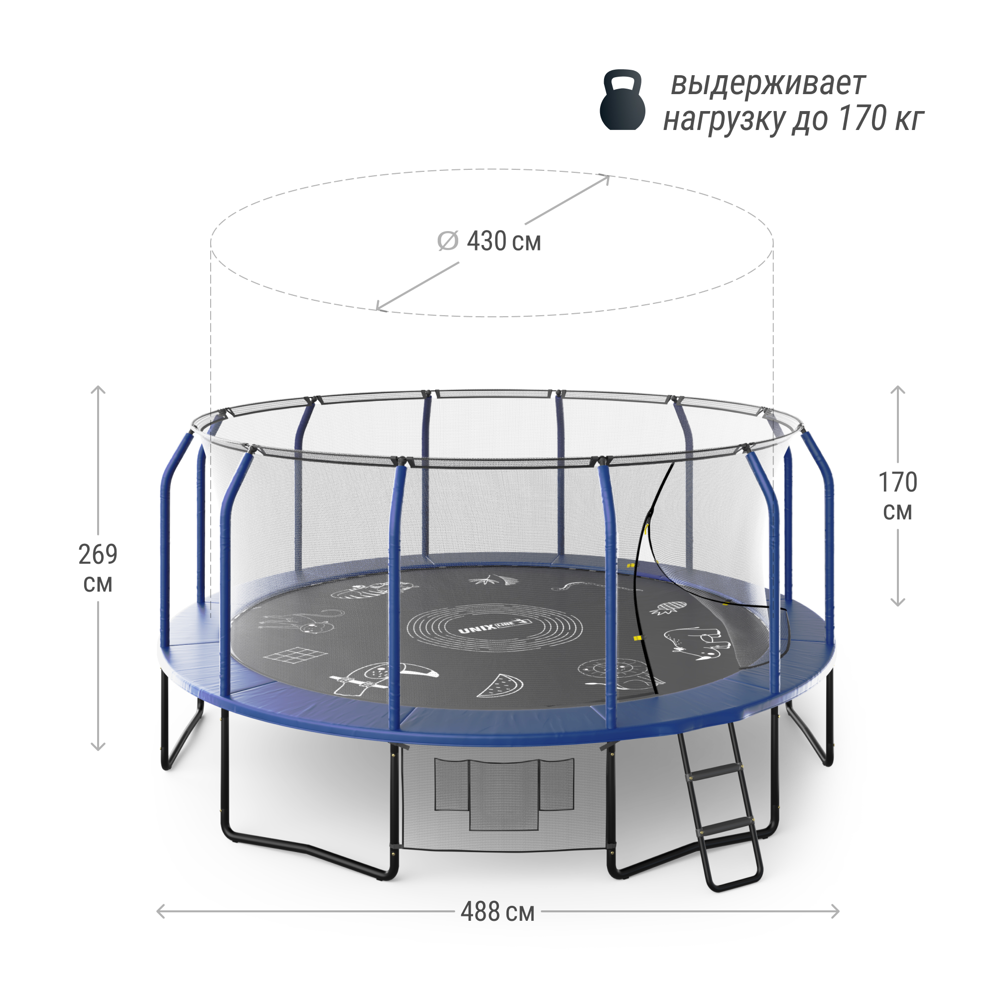 Помимо верхней защитной сетки, все батуты премиального модельного ряда UNIX line оборудованы нижней защитной сеткой, которая препятствует проникновению под прыжковое полотно батута детей, животных, а также попаданию посторонних предметов, и лестницей для удобства пользования. Так же в комплект входят специальные крепления батута к земле (колышки).Общее