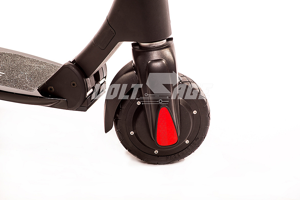 Модель оснащается достаточно мощным мотор-колесом, что обеспечивает высокую надежность. Мотор имеет мощность 250 Вт и способен развивать скорость до 30 километров в час. При этом значительный КПД мотора и емкость литий-ионного аккумулятора обеспечивают высокую автономность электросамоката. На одной зарядке батареи он способен проехать до 30 километров. Самокат комплектуется шоссейными колесами диаметром 5 дюймов с электрическим и механическим тормозом сзади. Автоматическое включение-выключение фары.