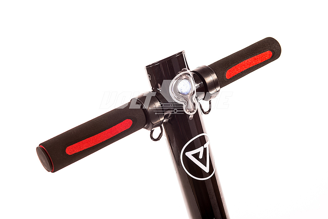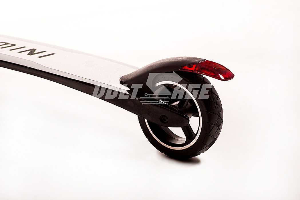 Электросамокат комплектуется шоссейными колесами диаметром 5 дюймов с электрическим и механическим тормозом сзади. Автоматическое включение-выключение фары.