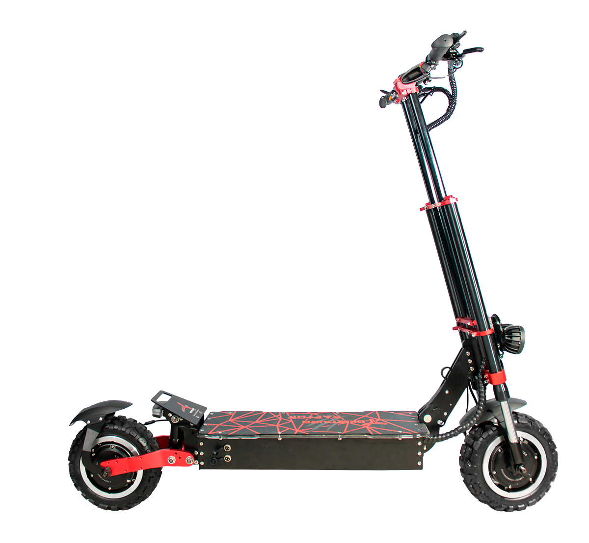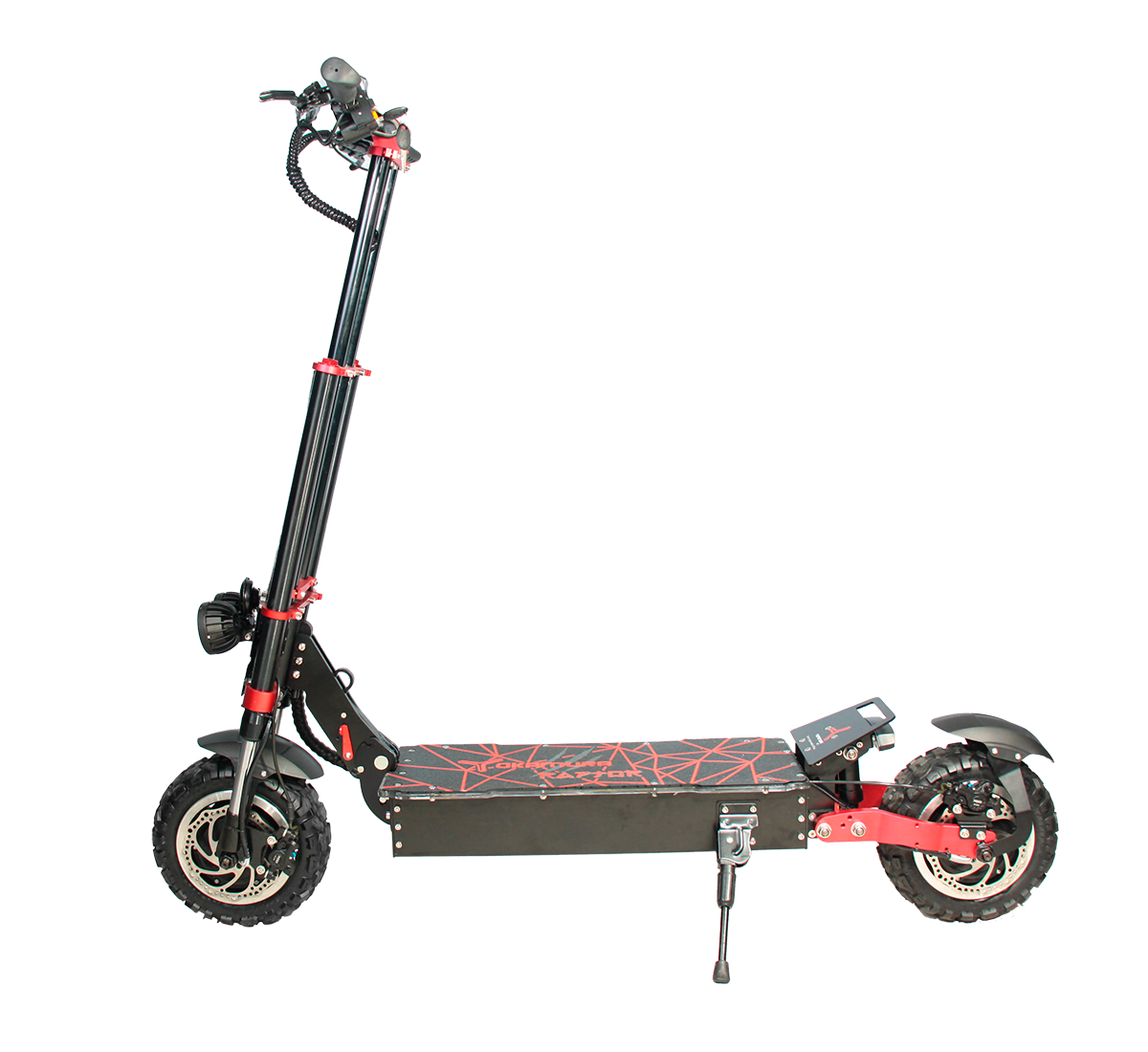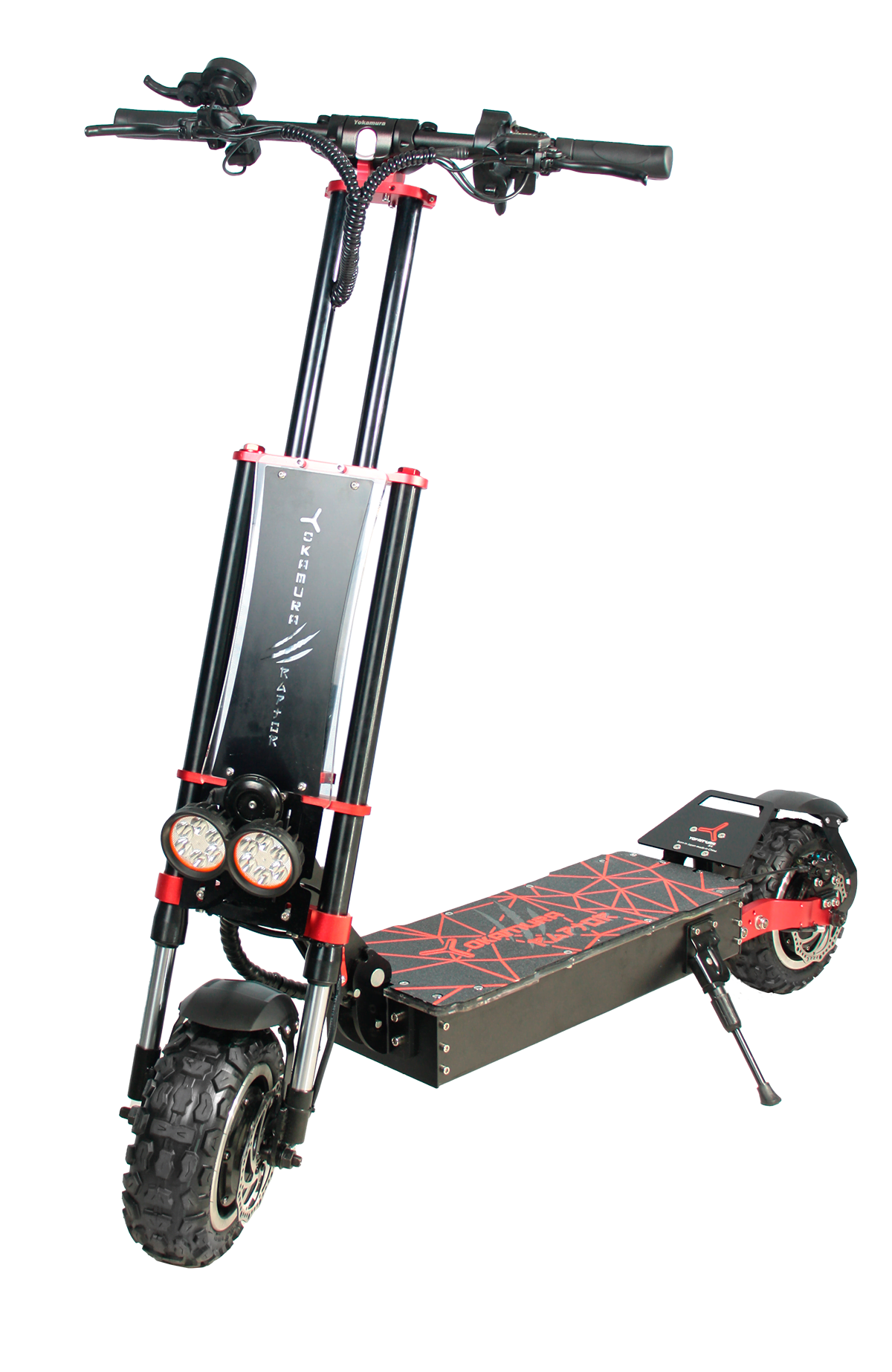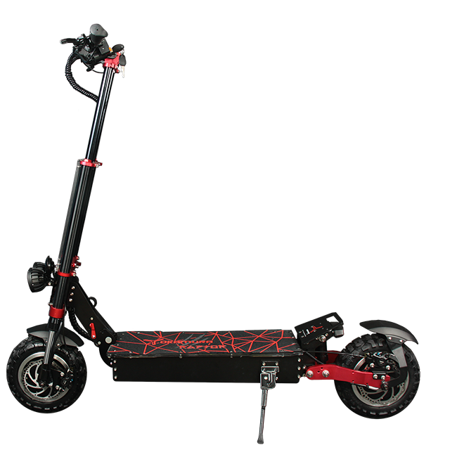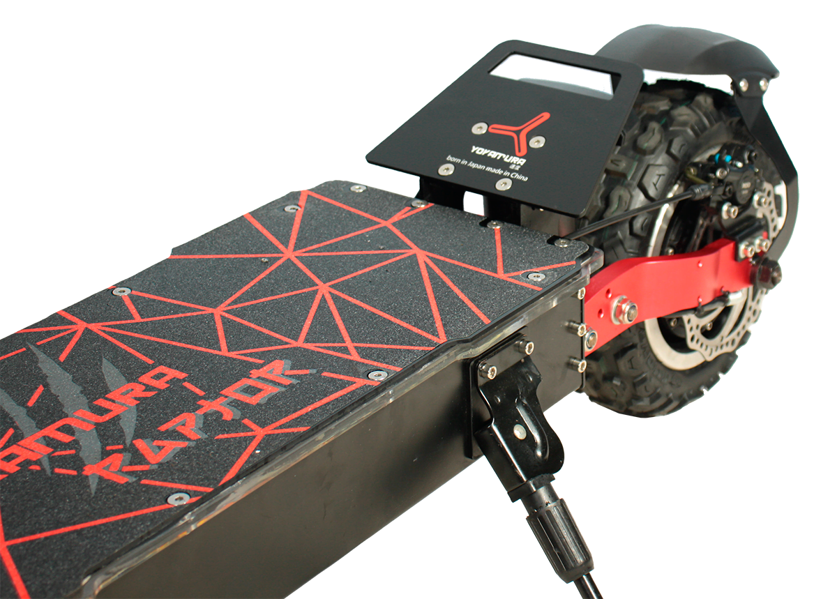 Yokamura Raptor занимает одну из лидирующий позиций по скорости, которая достигает отметки в 90км/ч. Самокат оборудован гидравлической мотовилкой, амортизатором заднего колеса, имеет 11-и дюймовых мотор-колеса по 3000w каждое. Raptor отлично показывает себя как на бездорожье так и на асфальте. Манёвренность, не смотря на размеры самоката удивляет. Удобство перемещения на дальнии дистанции обеспечивает мягкое сидение которое с легкостью можно установить на деку самоката.