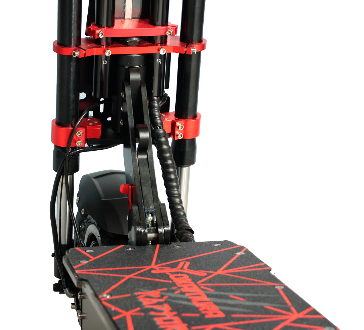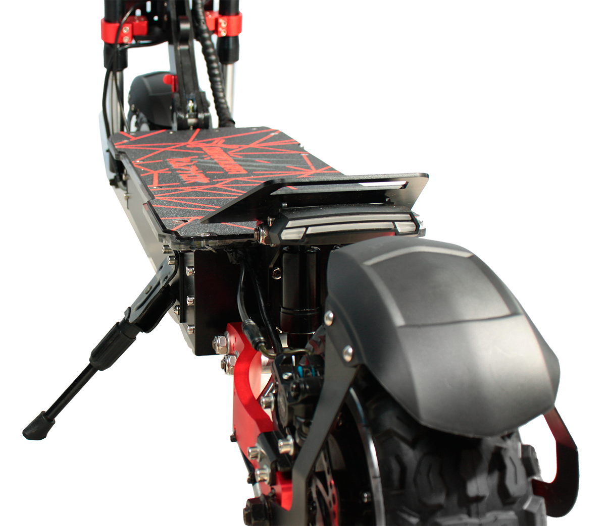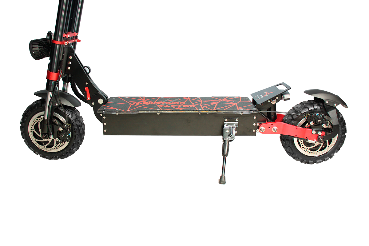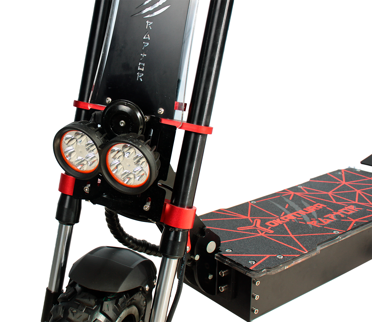 Raptor оснащен новейшими синусными контроллерами по 45А каждый, что дает самокату плавный и мгновенный набор скорости. Самокат собран из сверхпрочного алюминиевого сплава, оснащен гидравлическими тормозами, клаксоном, поворотниками, габаритными и стоп сигналами, яркой фарой. Что делает езду на данном самокате комфортной в любое время суток при любой погоде.