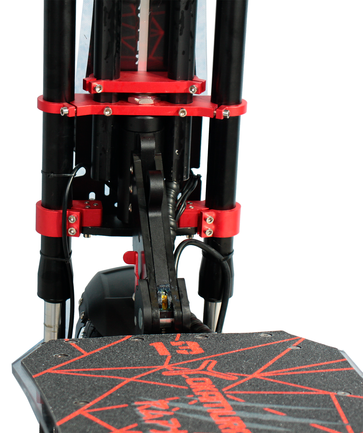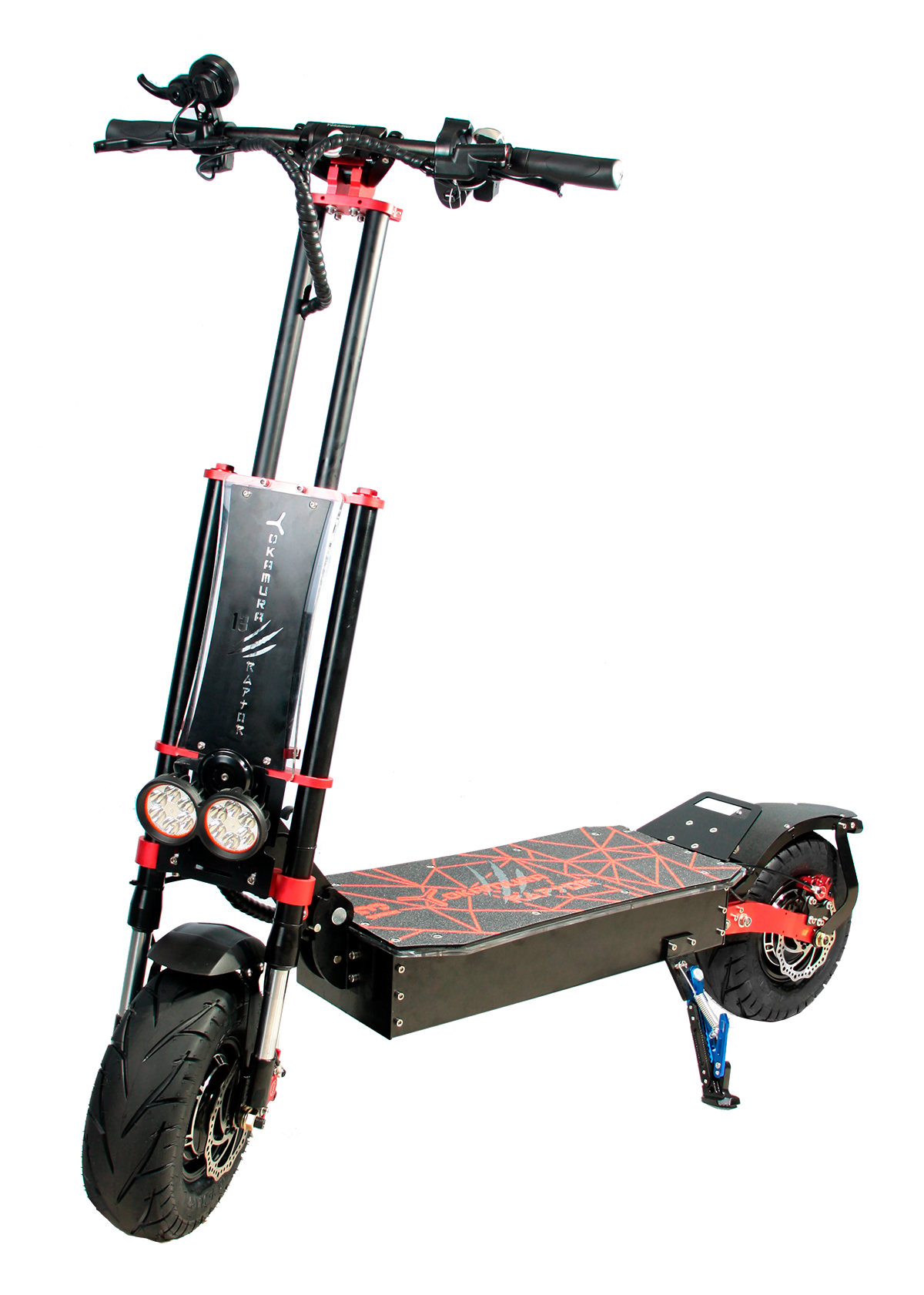 Yokamura Raptor 13 как и его собрат занимает одну из лидирующий позиций по скорости, которая достигает отметки в 80км/ч. Самокат оборудован гидравлической мотовилкой, амортизатором заднего колеса, имеет 13-и дюймовых мотор-колеса по 2500w каждое. Raptor отлично показывает себя как на бездорожье так и на асфальте. Манёвренность, не смотря на размеры самоката удивляет. Удобство перемещения на дальние дистанции обеспечивает мягкое сидение которое с легкостью можно установить на деку самоката.