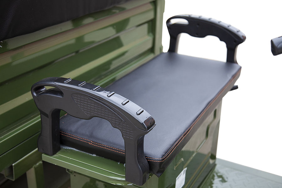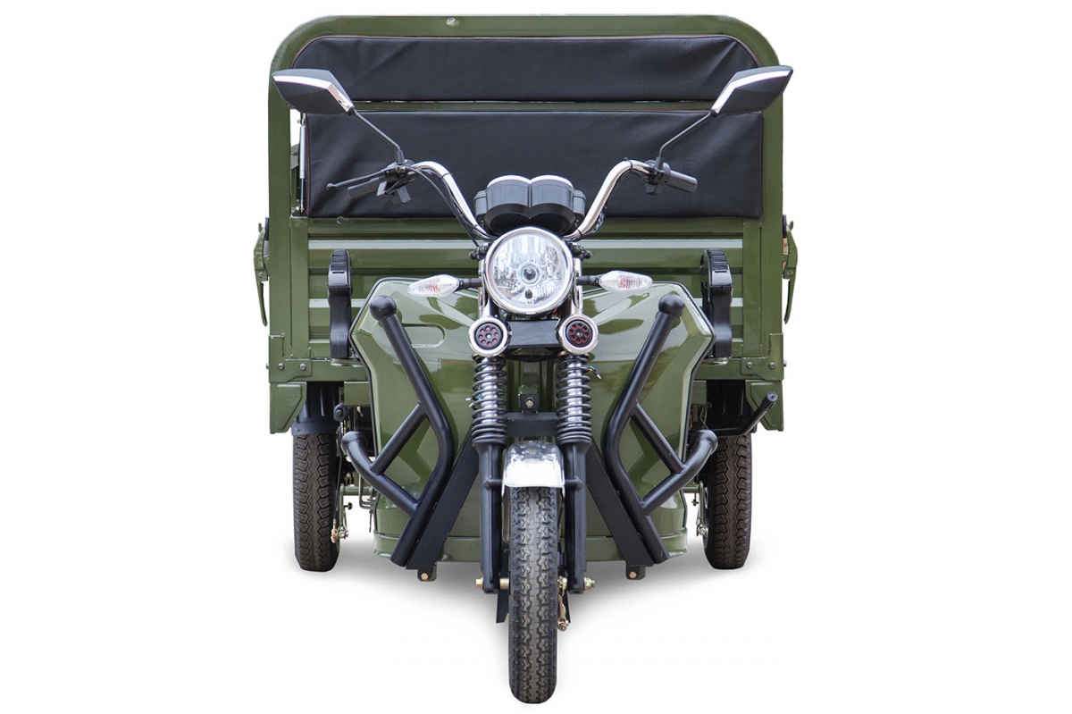 Трицикл оснащён надёжной и прочной передней гидравлической амортизационной вилкой, дополнительно усиленной пружинами.