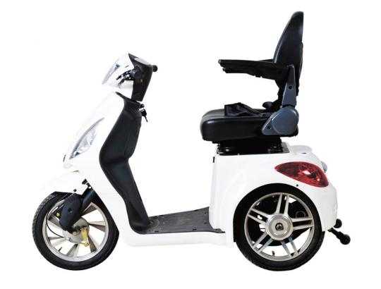 Электроскутер-трайк устойчив на дороге, в отличии от двухколёсной техники. Он обладает стильным ретро-дизайном и яркой свето-оптикой.