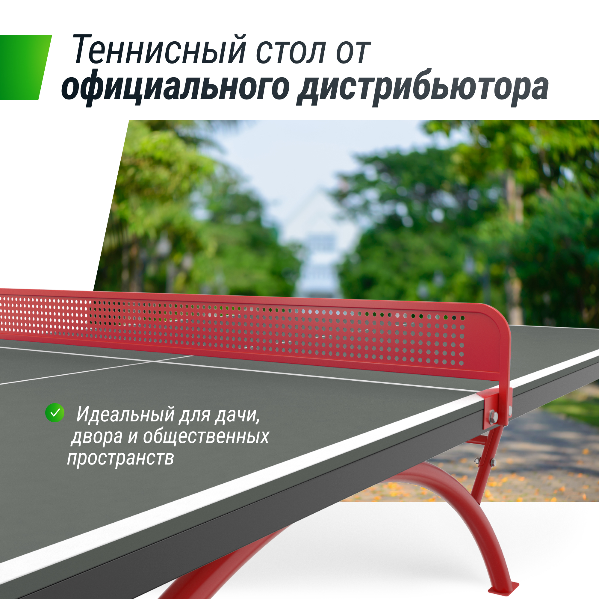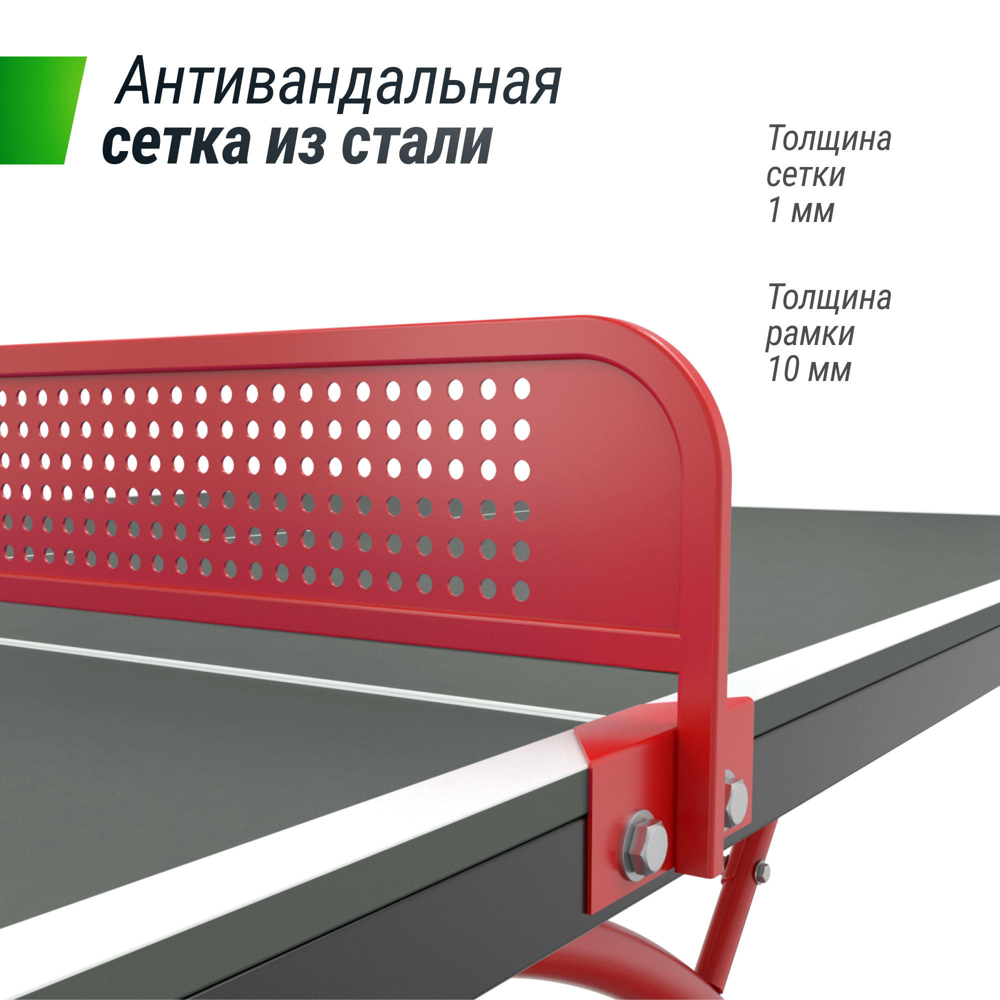 Антивандальная сетка с жестким креплением к столу изготовлена из стали толщиной 1 мм, толщина рамки составляет 10 мм. Благодаря этому, профессиональный стол отлично подходит для эксплуатации как в частных домах и на дачах, так и в общественных местах, таких как парки, школы и кемпинги.