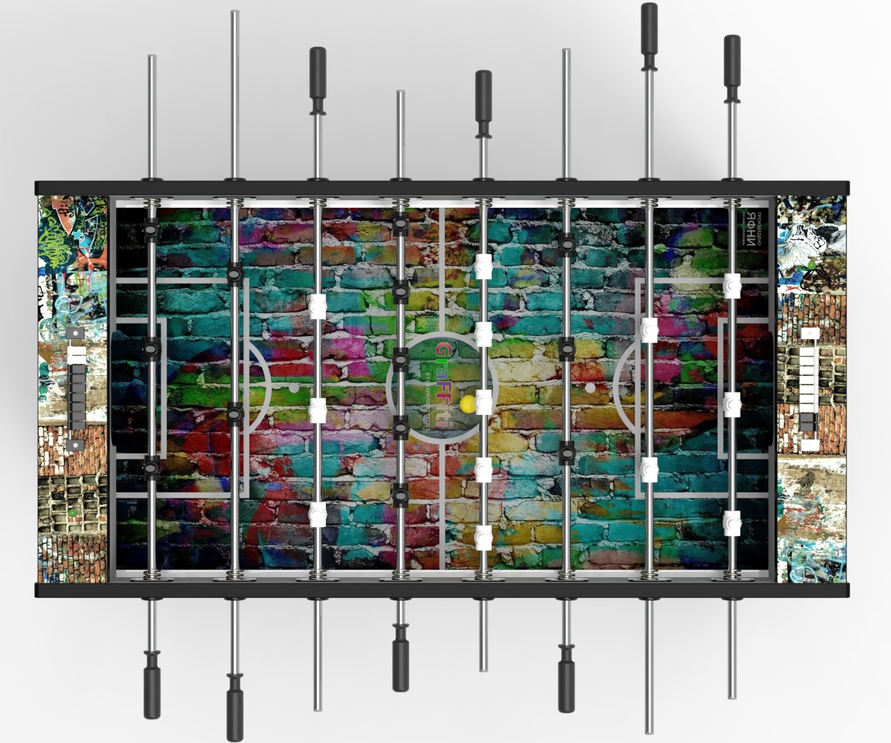Представляем вам стильный и уникальный настольный футбол от компании "Desperado Sport", который станет центром притяжения в любом помещении. Этот стол — не просто игра, это настоящее произведение искусства, воплощённое в игре. Его корпус украшен сочным и динамичным граффити-дизайном, который вызывает ассоциации с уличным искусством и свободой городской жизни. Яркие краски, энергичные линии и урбанистические мотивы делают каждый матч захватывающим и незабываемым.