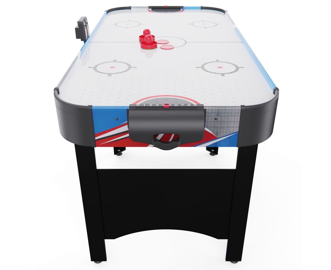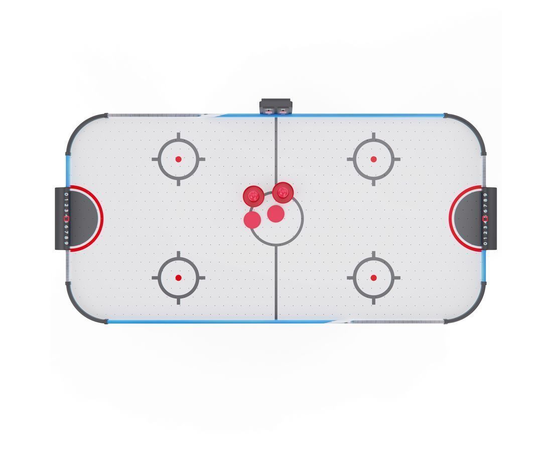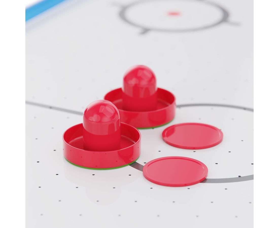 Аэрохоккей оснащён мощным вентилятором, работающим от сети 220 В, который создаёт равномерный воздушный поток по поверхности стола. За счёт этого шайба легко и быстро скользит по полю, обеспечивая максимальную динамику игры и реалистичный эффект настоящего хоккейного матча.