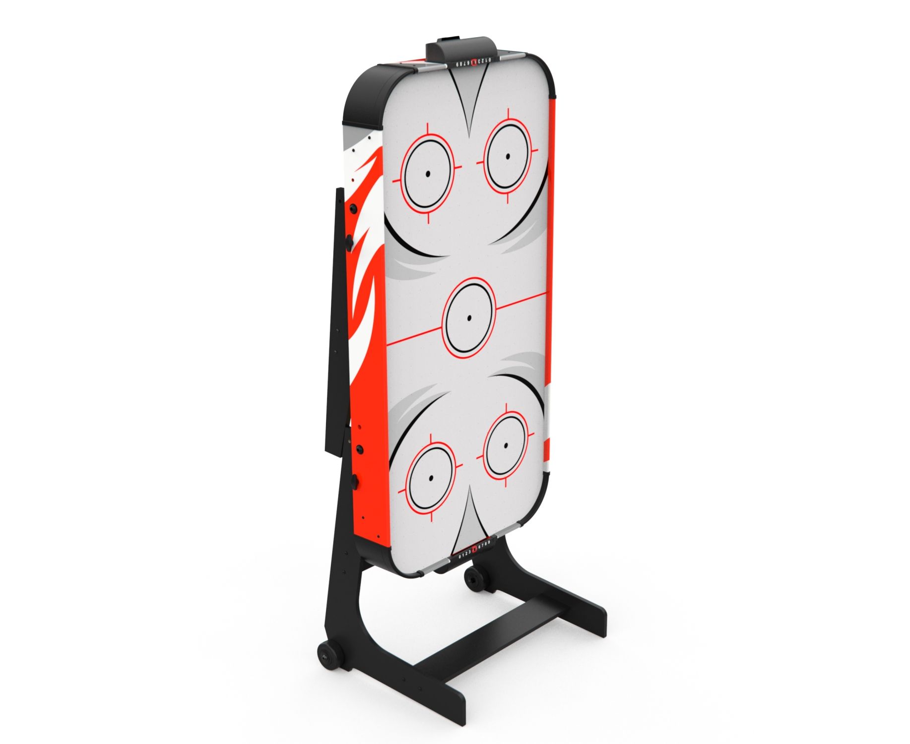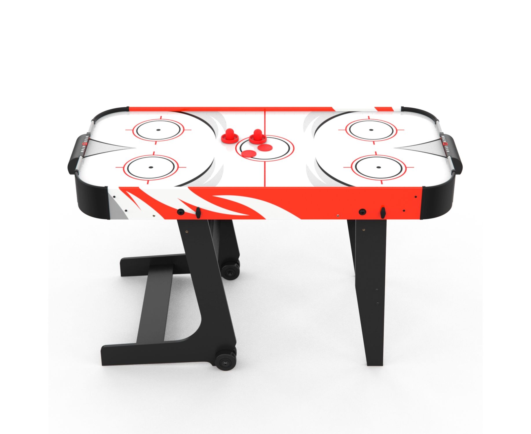 В комплект поставки входят 2 биты и 2 шайбы, а также механические счётчики голов. Стол работает от сети с напряжением 220 вольт. Аэрохоккей легко сложить и откатить в угол комнаты или за диван после игры.