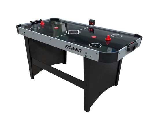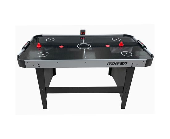 Технические характеристики стола впечатляют своей мощью и стабильностью. Размер рабочей поверхности составляет 152,5 х 75,5 х 81 см, а размер игрового поля – 149 х 73 см. Толщина бортов – 2,5 см. Стол оборудован электронным табло для подсчета очков. Корпус выполнен из специально обработанного МДФ, а сверху покрыт прочной пленкой из ПВХ. Все это обеспечивает высокое качество игры и длительный срок службы стола.В комплекте с аэрохоккеем ROWAN поставляются 2 биты и 2 шайбы. Мощный компрессор подает воздух через отверстия и создает поле, не требующее особых усилий для передвижения шайбы. Напряжение составляет 220В.