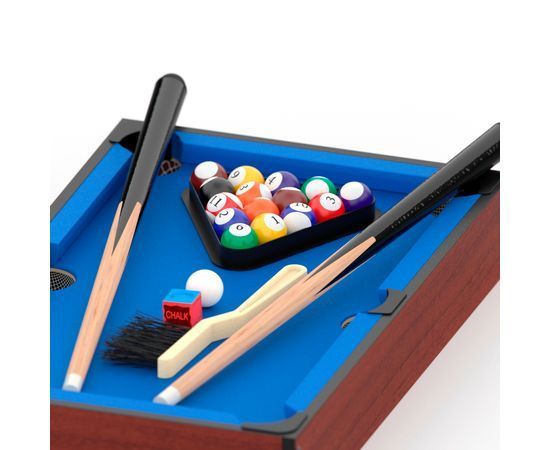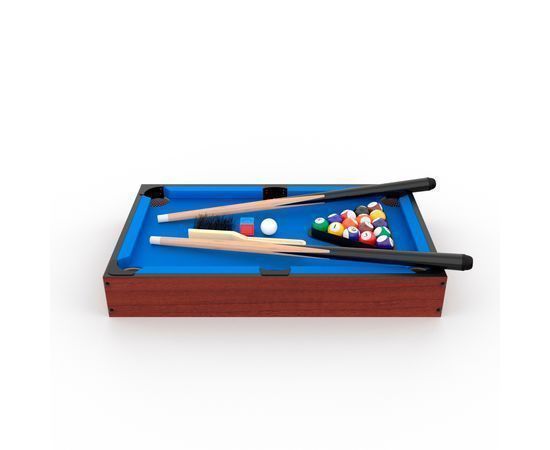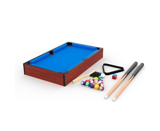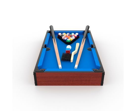 Стол изготовлен из МДФ толщиной 9 мм, цвет сукна синий. Размер игрового поля 45,5 х 25,4 см, бортики высотой 1 см и толщиной 7,5 см. Ширина луз 4,8 см.
