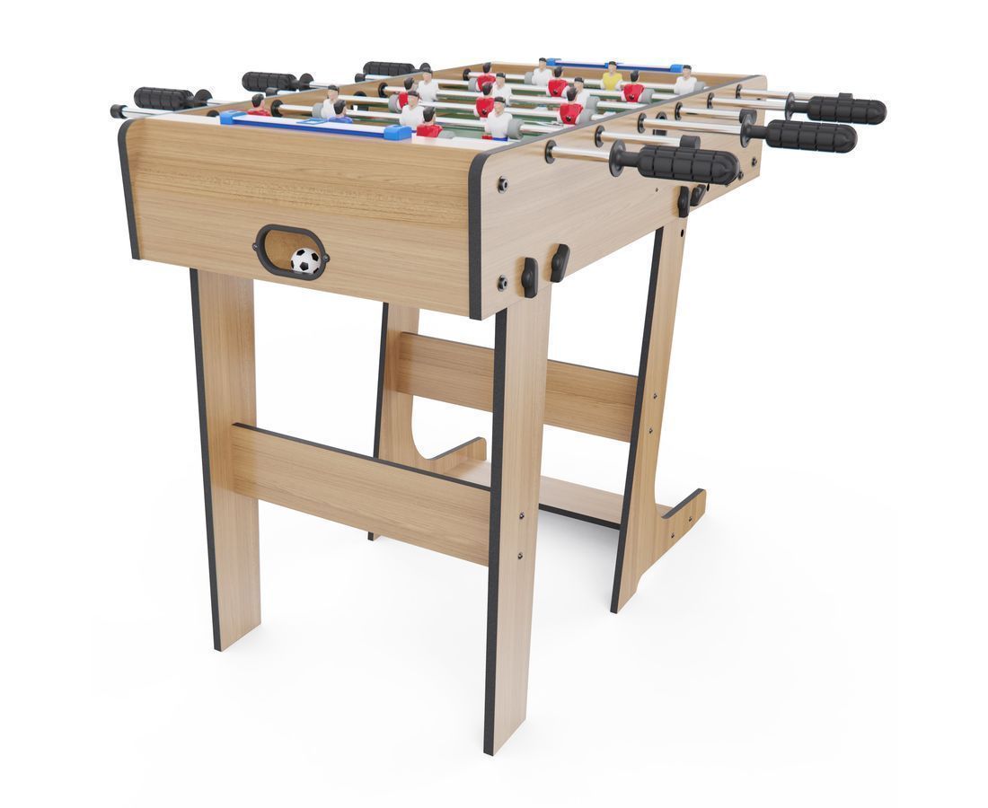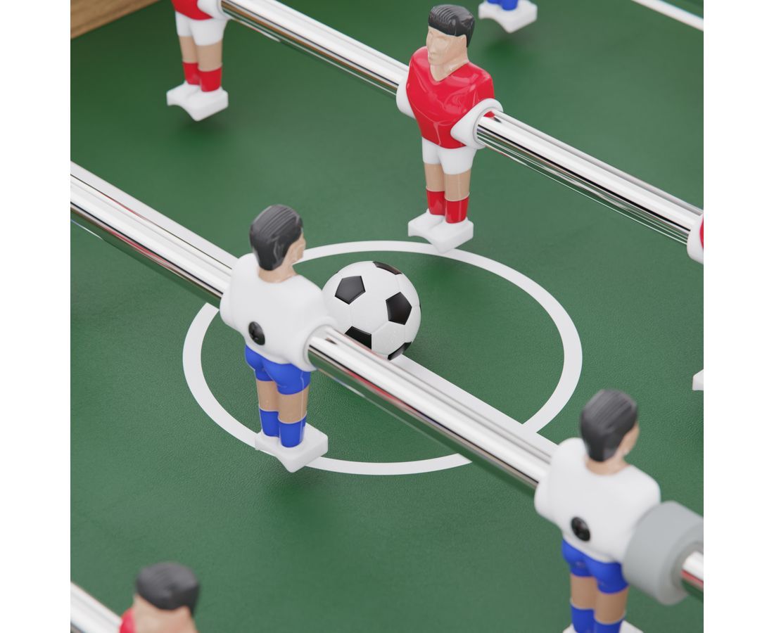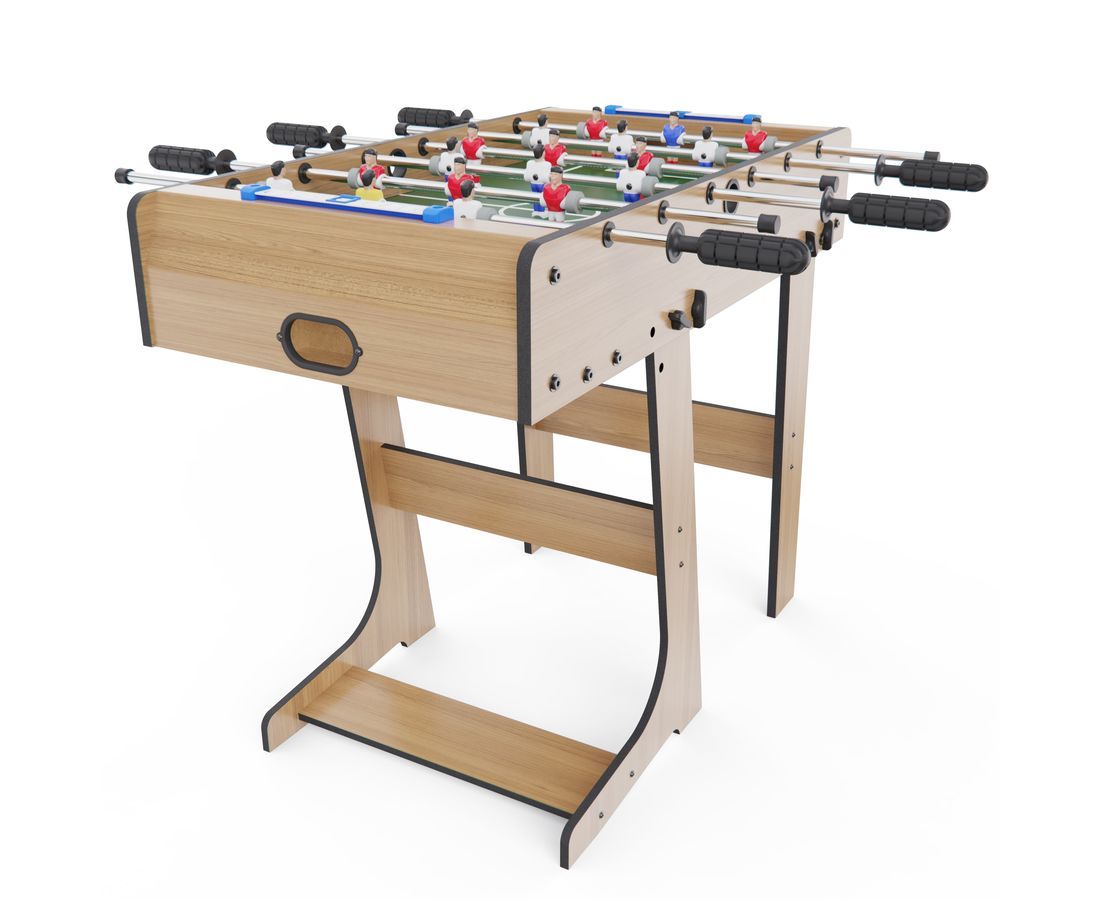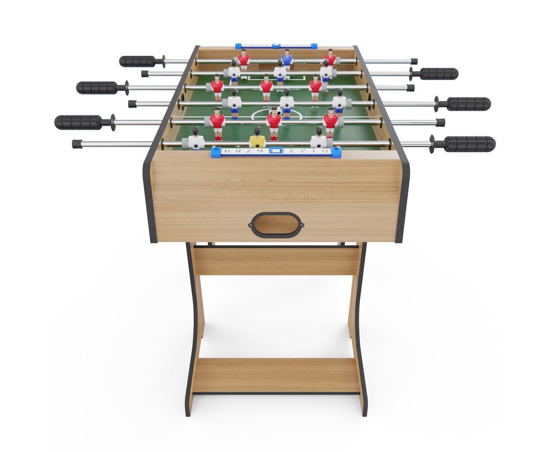 Высота ножек 60,5 см обеспечивает удобное расположение стола в помещении. Складная модель позволяет быстро сложить кикер после игры и убрать его на хранение, что особенно удобно для домашнего формата. В комплект входят 2 футбольных мяча, поэтому можно начинать игру сразу после сборки.