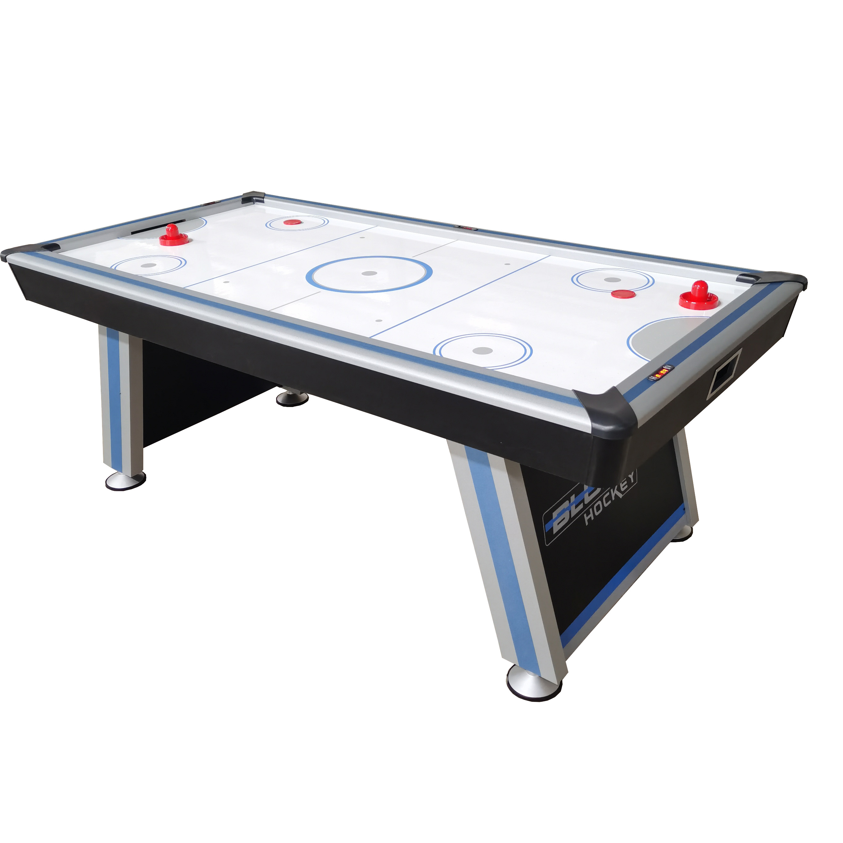 Стол оборудован электронным табло для подсчета очков и комплектуется набором аксессуаров (две биты и две шайбы).