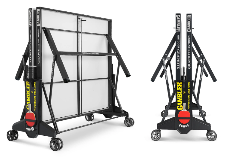Конструкция оснащается уникальной системой складывания, которая фиксирует теннисный стол в сложенном и разложенном виде.